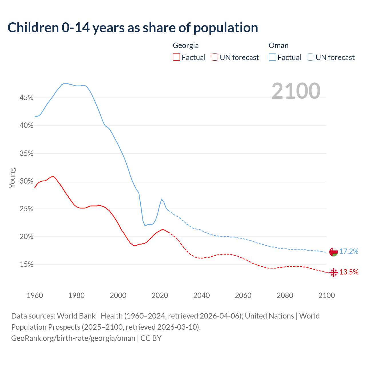 Georgia has an annual birth rate of 11.5 births per 1,000 people, compared to 16.8 for Oman. The average number of children a woman is expected to have during her lifetime — the fertility rate, is 1.81 in Georgia and 2.53 in Oman — 39.5% difference.