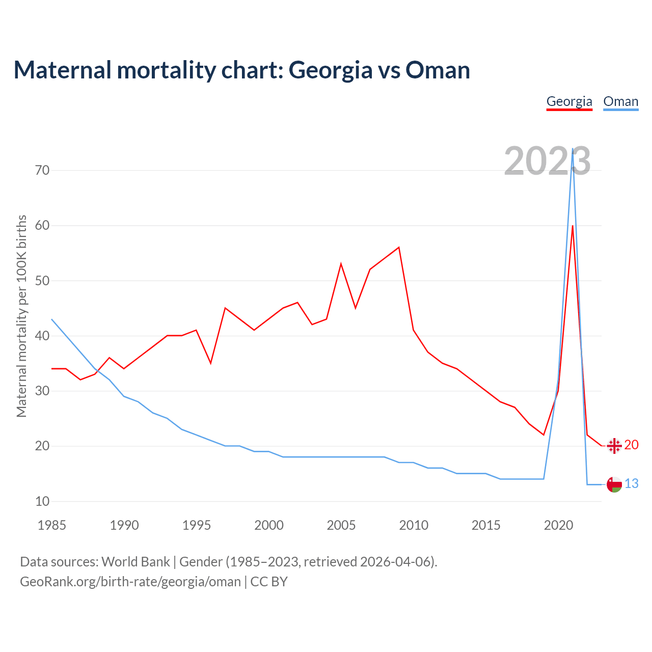 The maternal mortality rate, which is the probability of dying during childbirth or within 42 days of pregnancy termination, is 20 deaths per 100,000 live births in Georgia, compared to 13 deaths in Oman.
