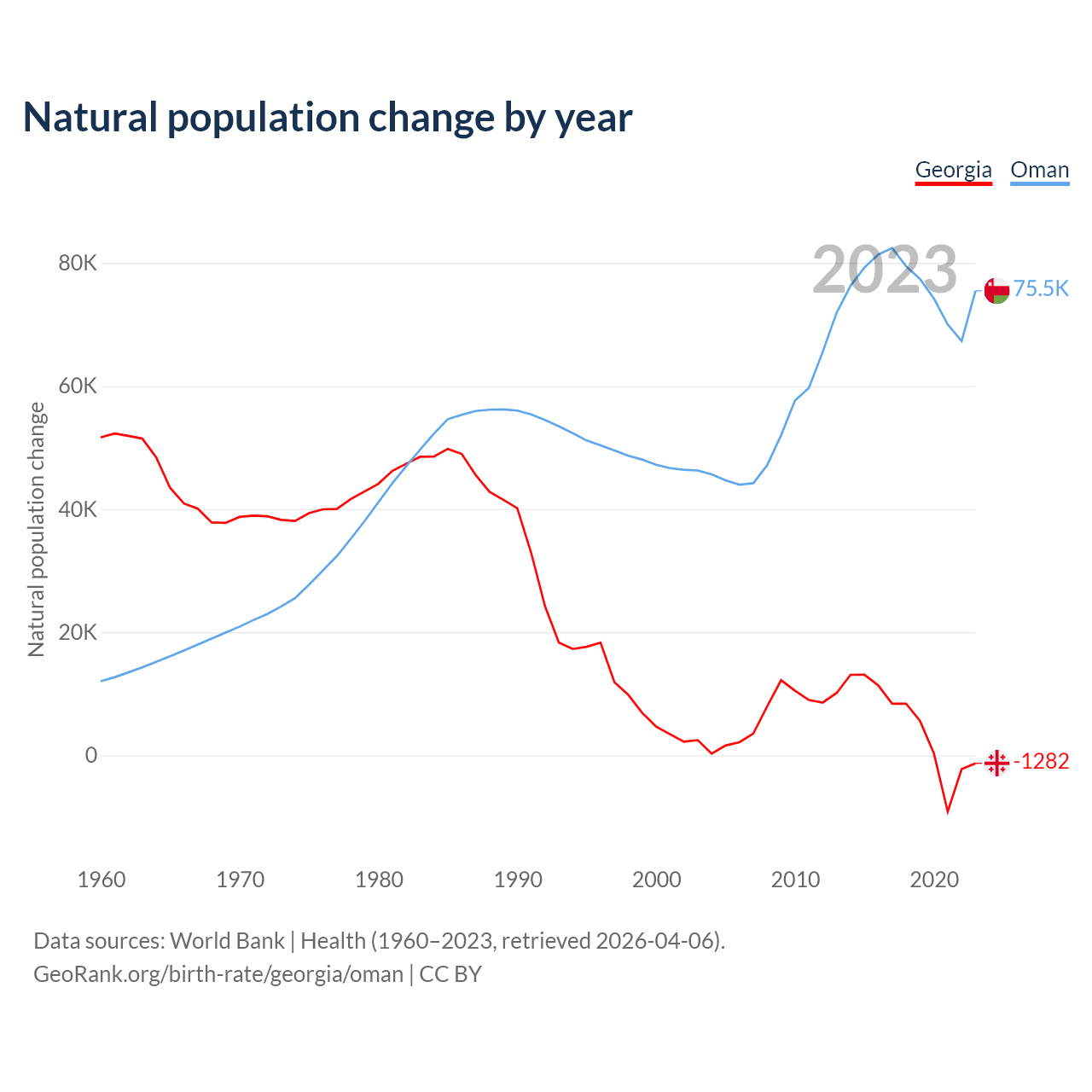 According to the latest available data on birth rates, the fertility rate in Georgia was 1.81 children per woman in 2023, compared to 2.53 in Oman in 2023. The replacement level is considered to be 2.1 children per woman.