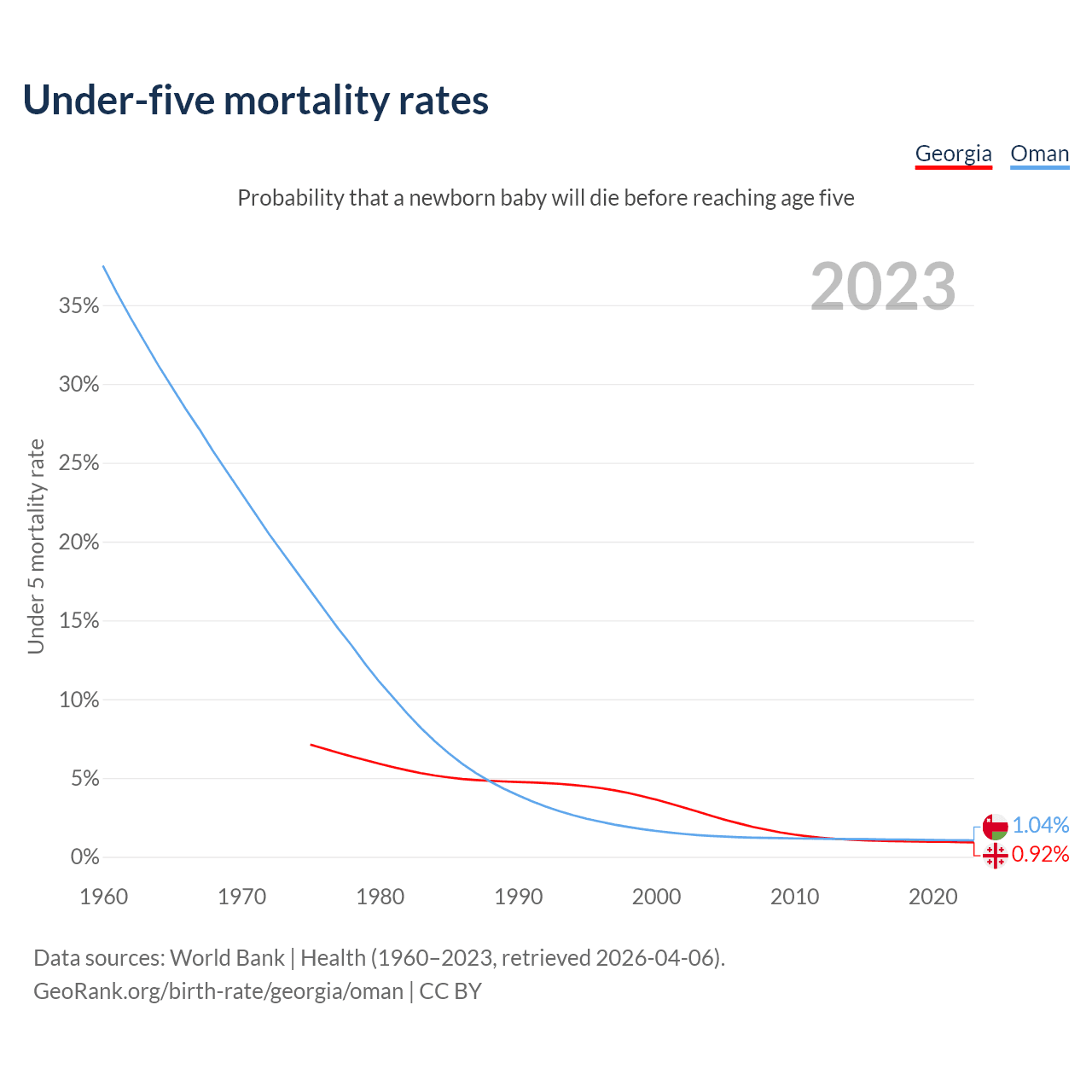 The chance that a newborn baby will die before reaching age five is 0.92% in Georgia and 1.04% in Oman. Above is a chart with historical data on under-five mortality rates.