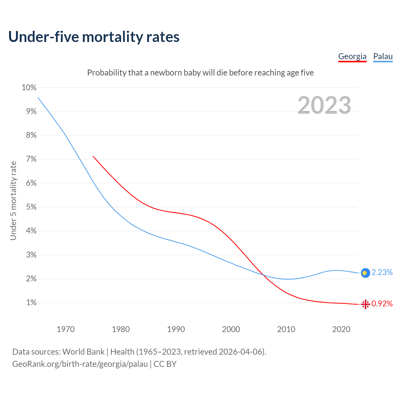 The chance that a newborn baby will die before reaching age five is 0.92% in Georgia and 2.23% in Palau. Above is a chart with historical data on under-five mortality rates.