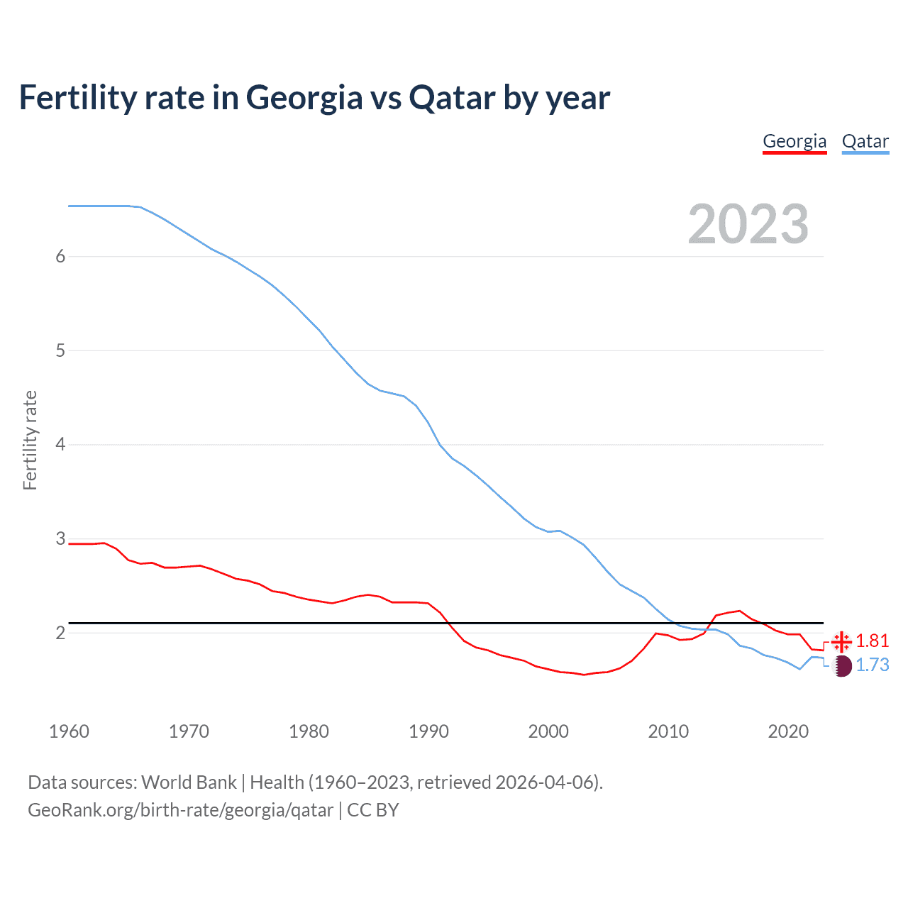 1960 vs 2023, the fertility rate has decreased by 38.5% in Georgia and by 73.5% in Qatar — in 1960, it was 2.94 and 6.53, respectively.