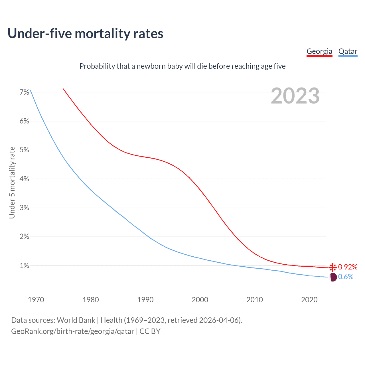 The chance that a newborn baby will die before reaching age five is 0.92% in Georgia and 0.6% in Qatar. Above is a chart with historical data on under-five mortality rates.
