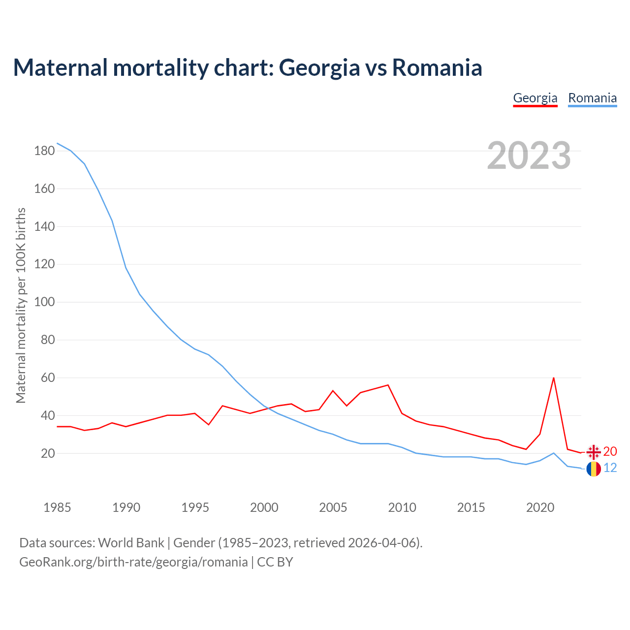 The maternal mortality rate, which is the probability of dying during childbirth or within 42 days of pregnancy termination, is 20 deaths per 100,000 live births in Georgia, compared to 12 deaths in Romania.