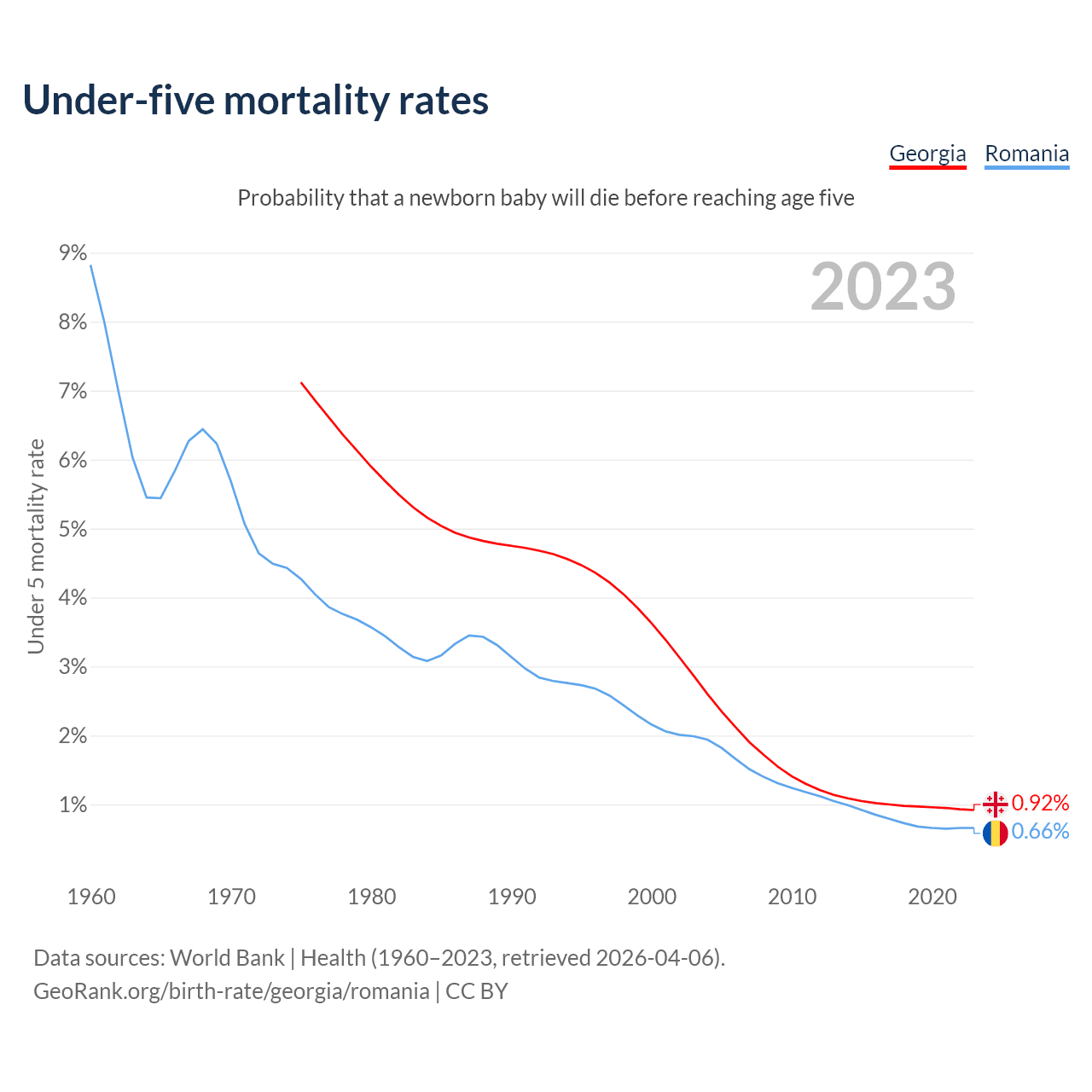 The chance that a newborn baby will die before reaching age five is 0.92% in Georgia and 0.66% in Romania. Above is a chart with historical data on under-five mortality rates.
