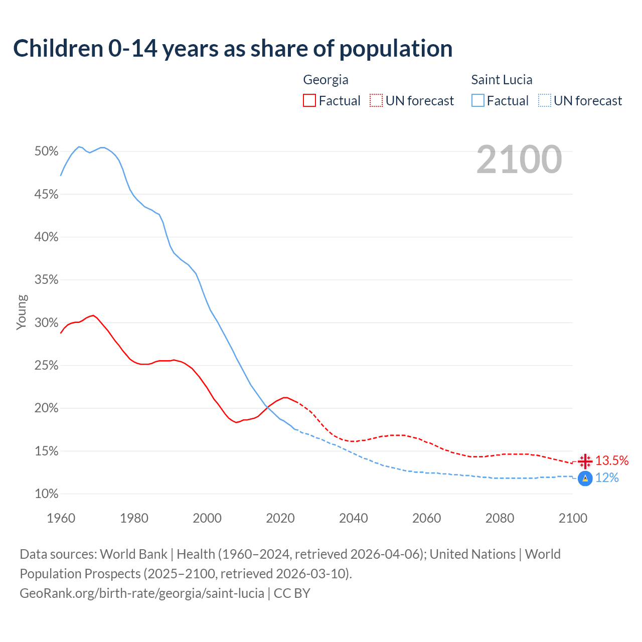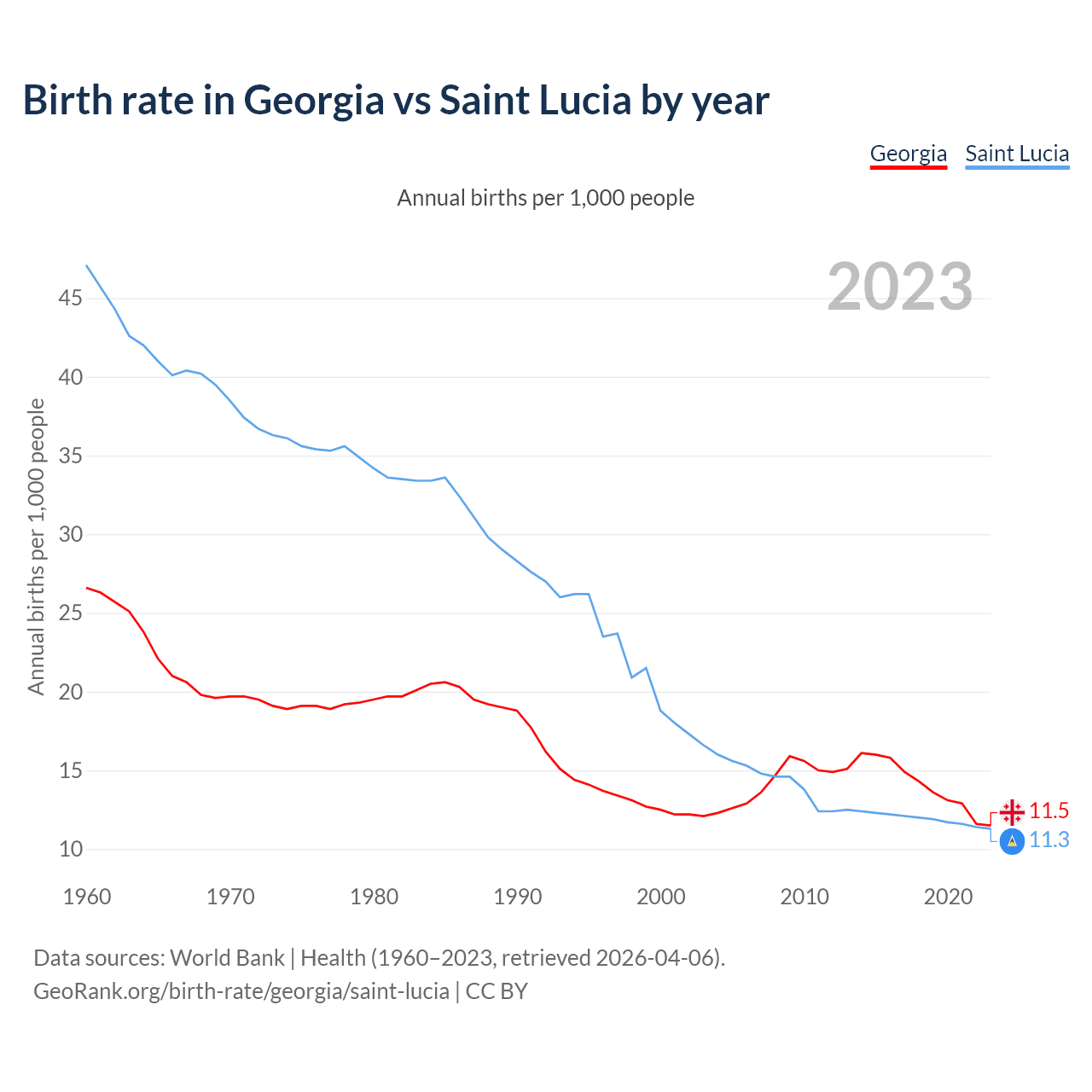 Georgia has an annual birth rate of 11.5 births per 1,000 people, compared to 11.3 for Saint Lucia. The average number of children a woman is expected to have during her lifetime — the fertility rate, is 1.81 in Georgia and 1.38 in Saint Lucia — 23.8% difference.