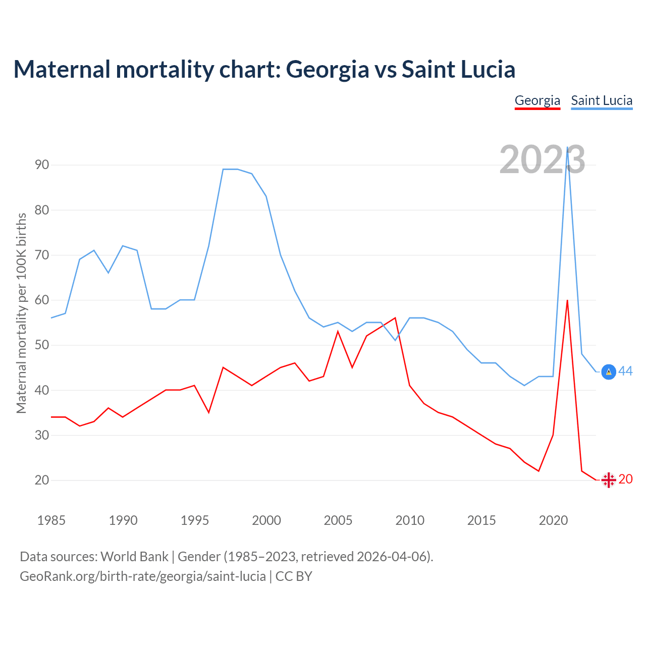 The maternal mortality rate, which is the probability of dying during childbirth or within 42 days of pregnancy termination, is 20 deaths per 100,000 live births in Georgia, compared to 44 deaths in Saint Lucia.