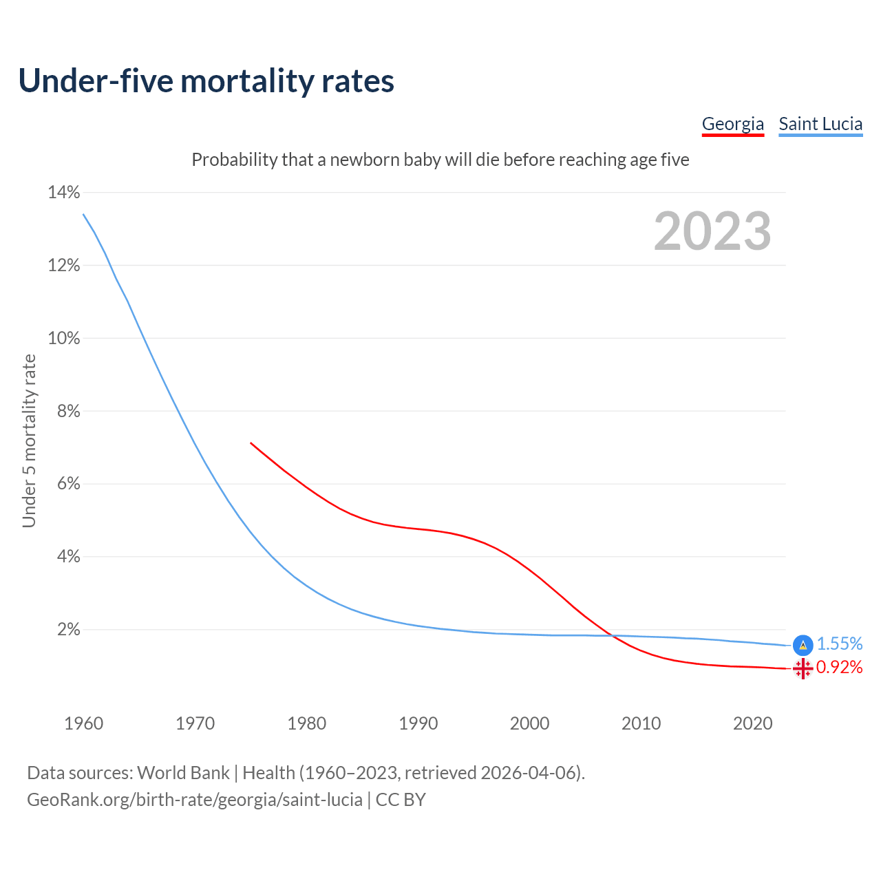 The chance that a newborn baby will die before reaching age five is 0.92% in Georgia and 1.55% in Saint Lucia. Above is a chart with historical data on under-five mortality rates.