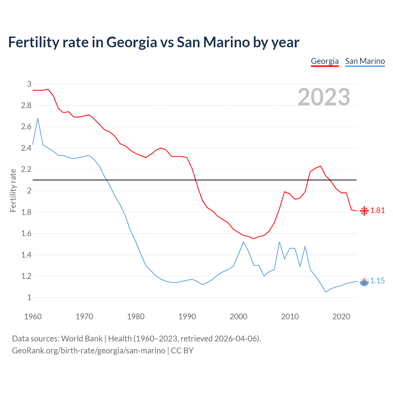 1960 vs 2023, the fertility rate has decreased by 38.5% in Georgia and by 52.7% in San Marino — in 1960, it was 2.94 and 2.43, respectively.