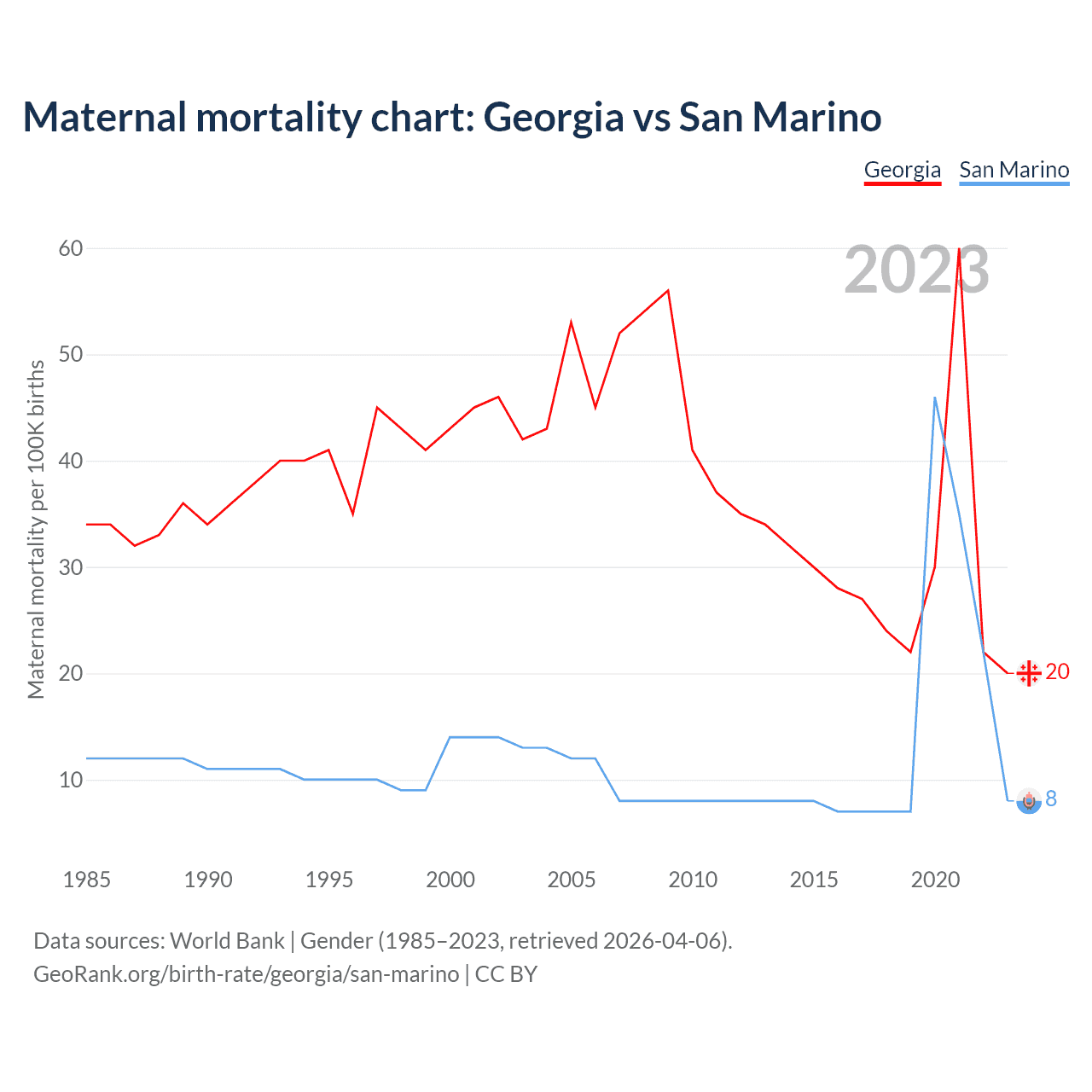 The maternal mortality rate, which is the probability of dying during childbirth or within 42 days of pregnancy termination, is 20 deaths per 100,000 live births in Georgia, compared to 8 deaths in San Marino.