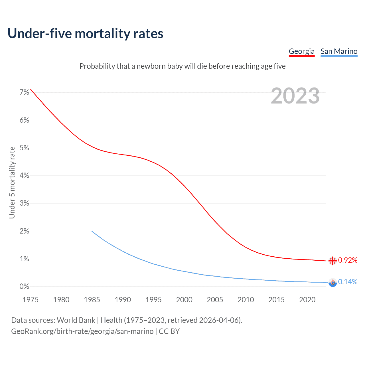 The chance that a newborn baby will die before reaching age five is 0.92% in Georgia and 0.14% in San Marino. Above is a chart with historical data on under-five mortality rates.