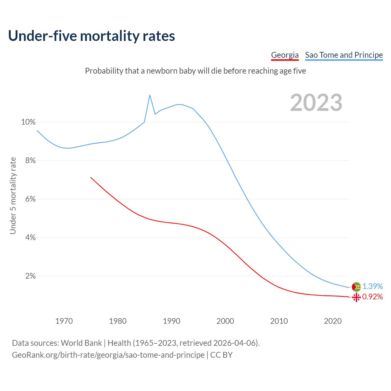 The chance that a newborn baby will die before reaching age five is 0.92% in Georgia and 1.39% in Sao Tome and Principe. Above is a chart with historical data on under-five mortality rates.