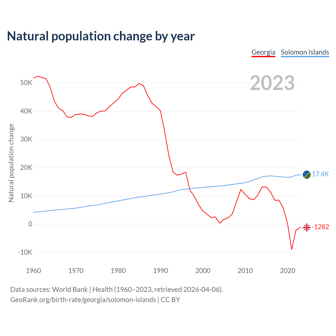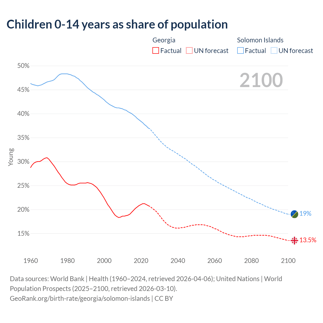Georgia has an annual birth rate of 11.5 births per 1,000 people, compared to 26.9 for the Solomon Islands. The average number of children a woman is expected to have during her lifetime — the fertility rate, is 1.81 in Georgia and 3.56 in the Solomon Islands — 96.5% difference.