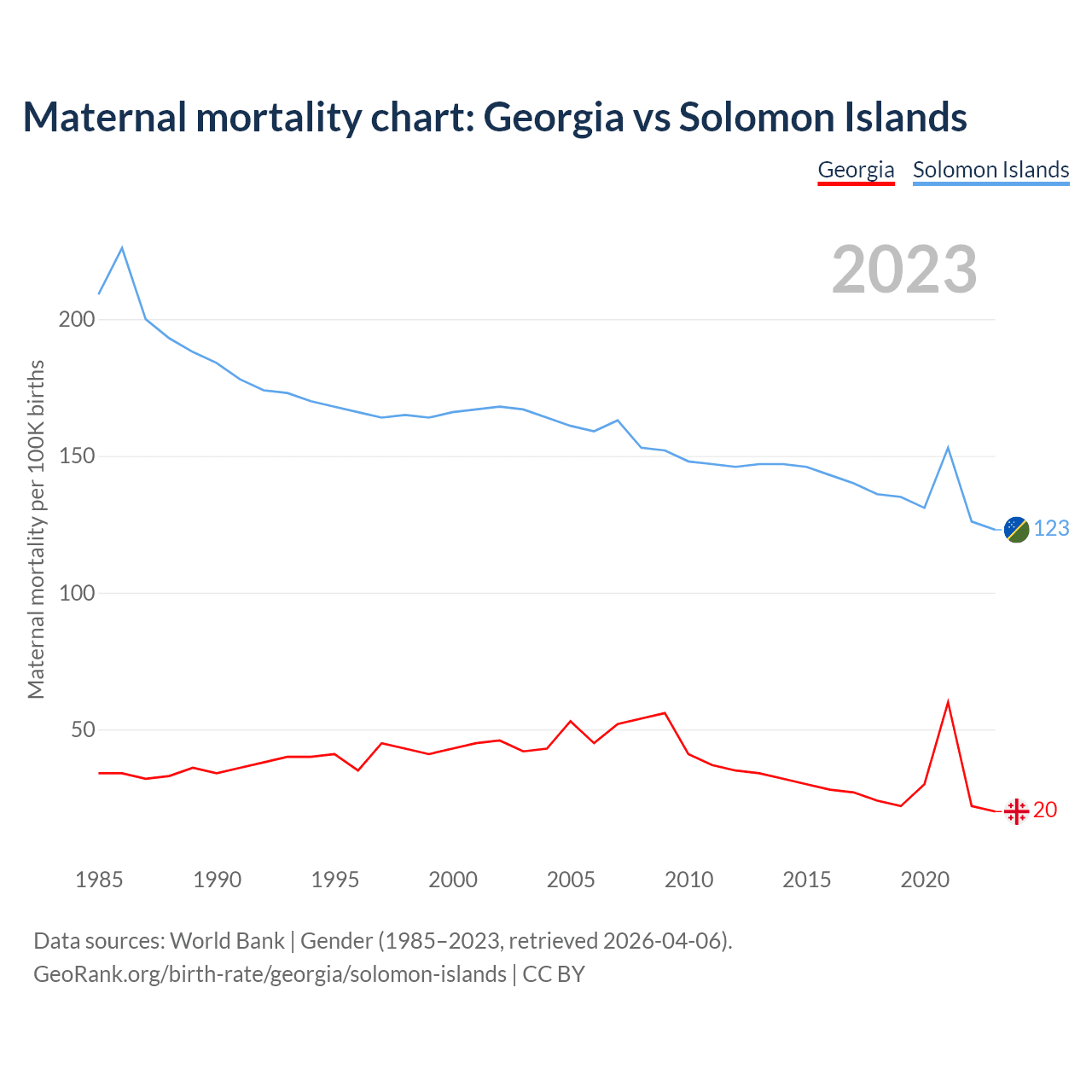 - Annual births per 1,000 women ages 15-19 (adolescent birth rate or teenage mother rate) is 21.1 in Georgia vs 50.4 in the Solomon Islands.