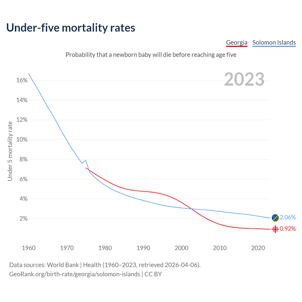 The chance that a newborn baby will die before reaching age five is 0.92% in Georgia and 2.06% in the Solomon Islands. Above is a chart with historical data on under-five mortality rates.