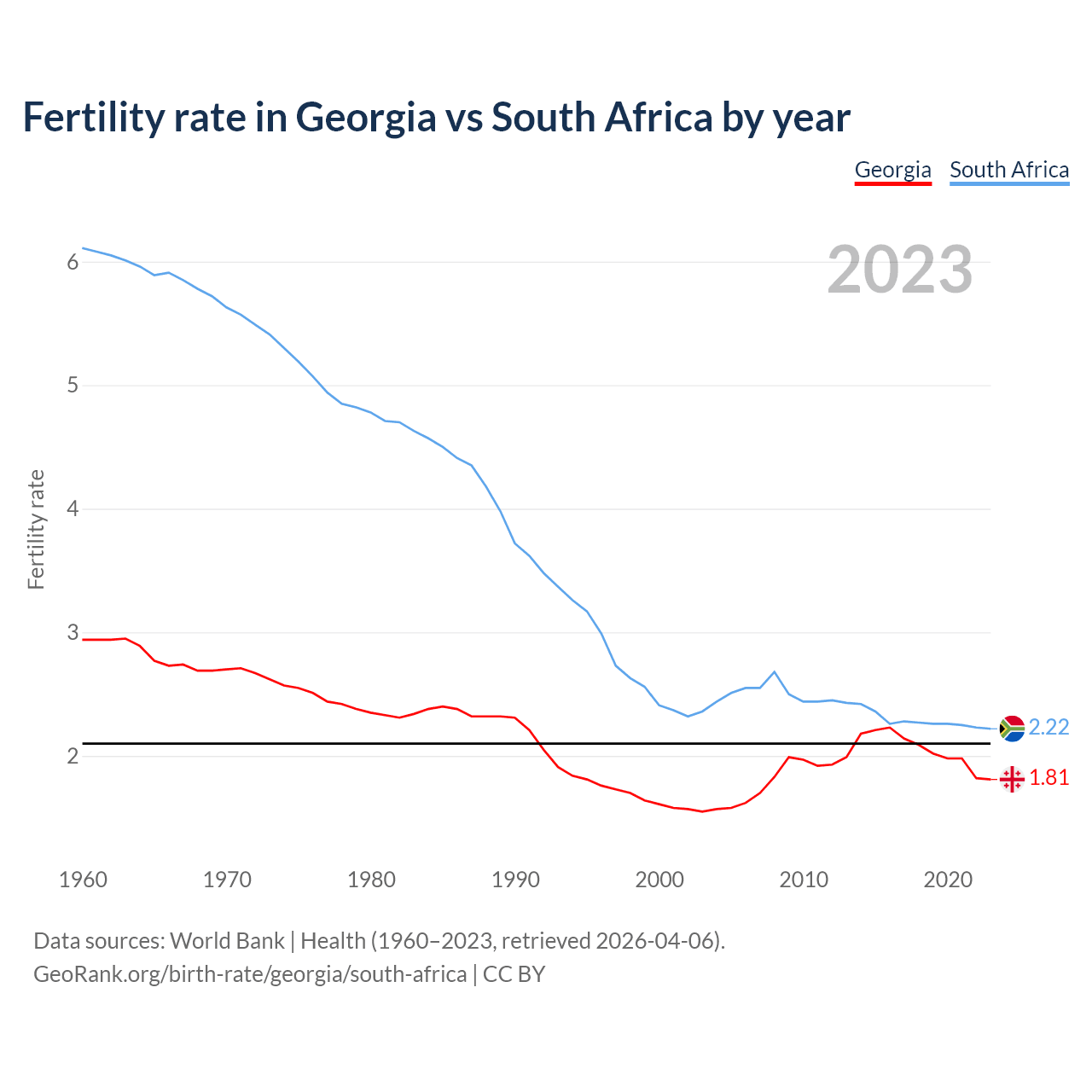 According to the latest available data on birth rates, the fertility rate in Georgia was 1.81 children per woman in 2023, compared to 2.22 in South Africa in 2023. The replacement level is considered to be 2.1 children per woman.