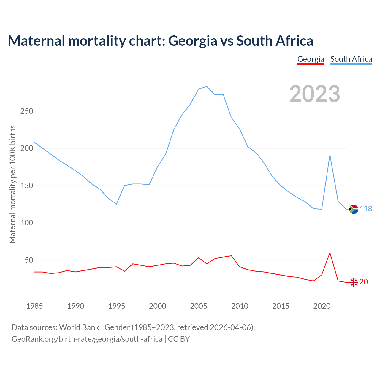 The maternal mortality rate, which is the probability of dying during childbirth or within 42 days of pregnancy termination, is 20 deaths per 100,000 live births in Georgia, compared to 118 deaths in South Africa.