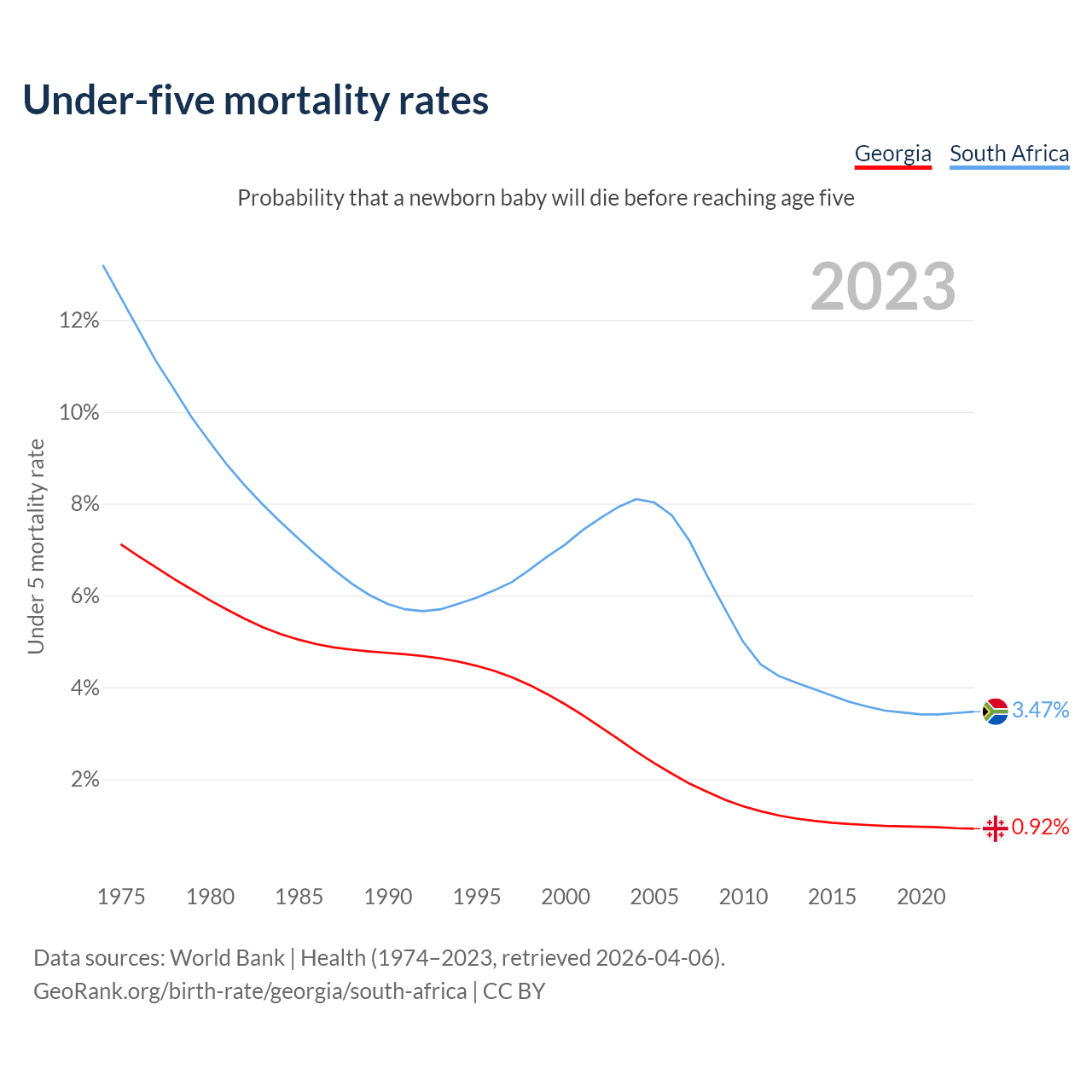 The chance that a newborn baby will die before reaching age five is 0.92% in Georgia and 3.47% in South Africa. Above is a chart with historical data on under-five mortality rates.