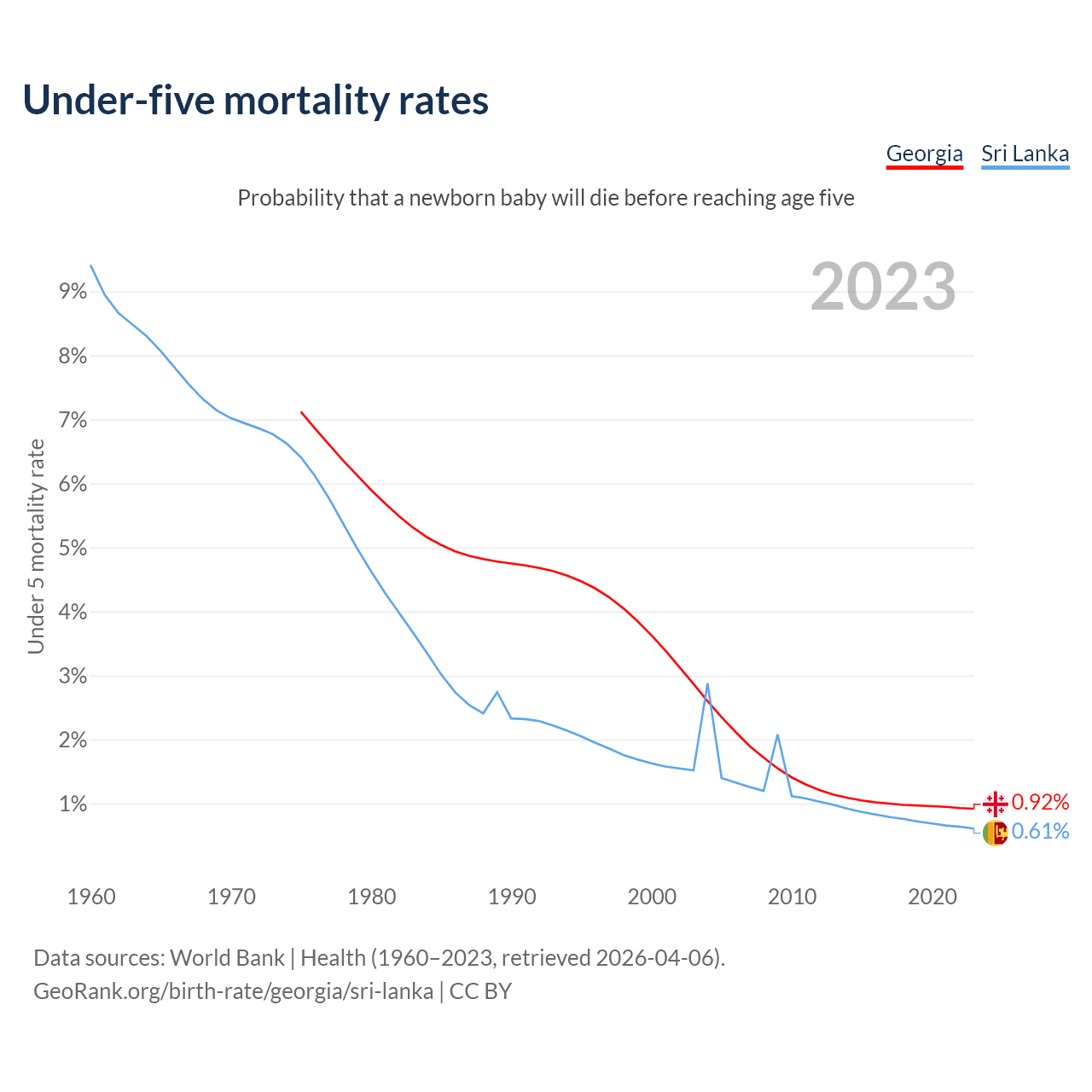 The chance that a newborn baby will die before reaching age five is 0.92% in Georgia and 0.61% in Sri Lanka. Above is a chart with historical data on under-five mortality rates.