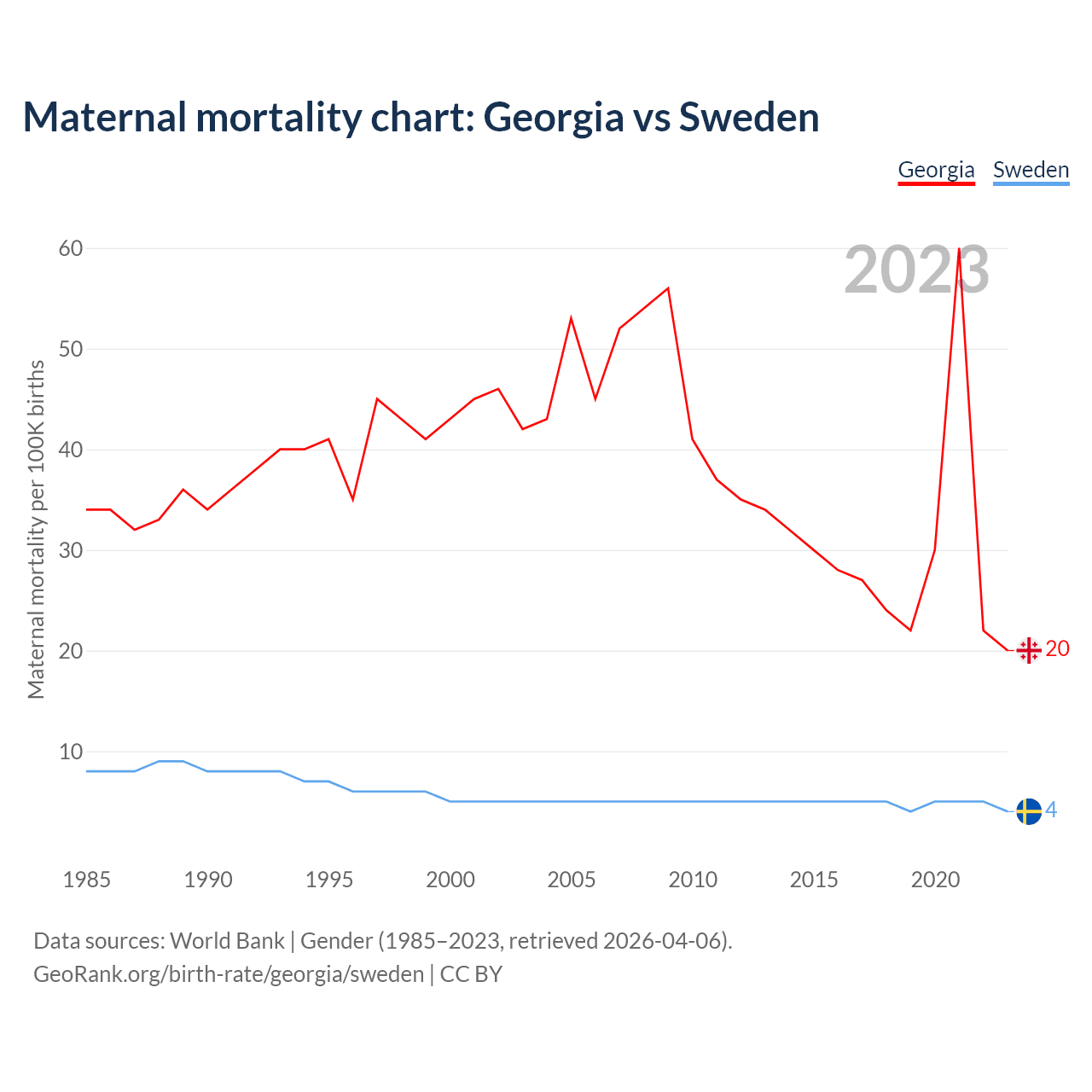The maternal mortality rate, which is the probability of dying during childbirth or within 42 days of pregnancy termination, is 20 deaths per 100,000 live births in Georgia, compared to 4 deaths in Sweden.