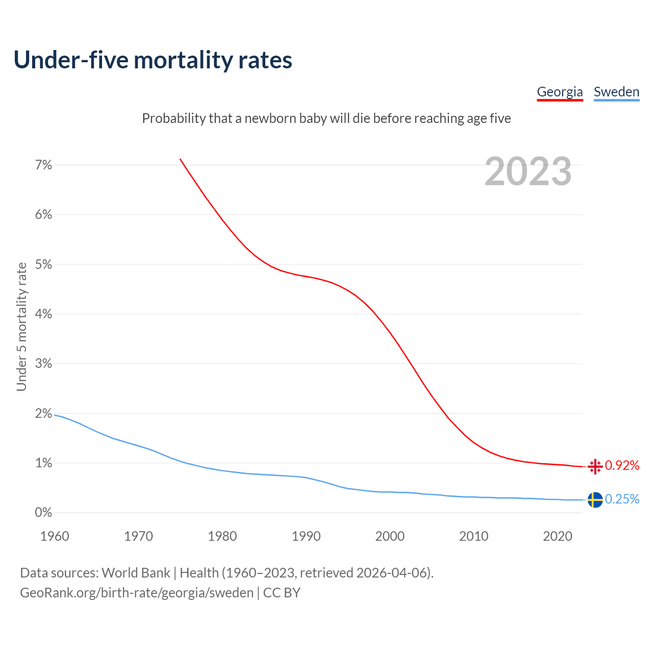 The chance that a newborn baby will die before reaching age five is 0.92% in Georgia and 0.25% in Sweden. Above is a chart with historical data on under-five mortality rates.