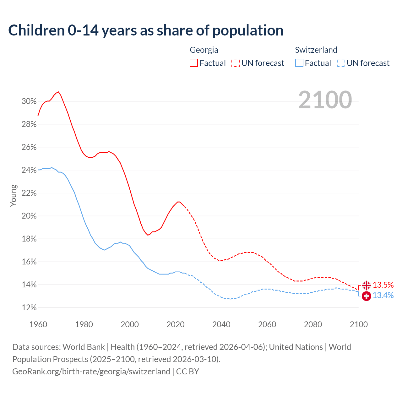 Georgia has an annual birth rate of 11.5 births per 1,000 people, compared to 9 for Switzerland. The average number of children a woman is expected to have during her lifetime — the fertility rate, is 1.81 in Georgia and 1.33 in Switzerland — 26.5% difference.