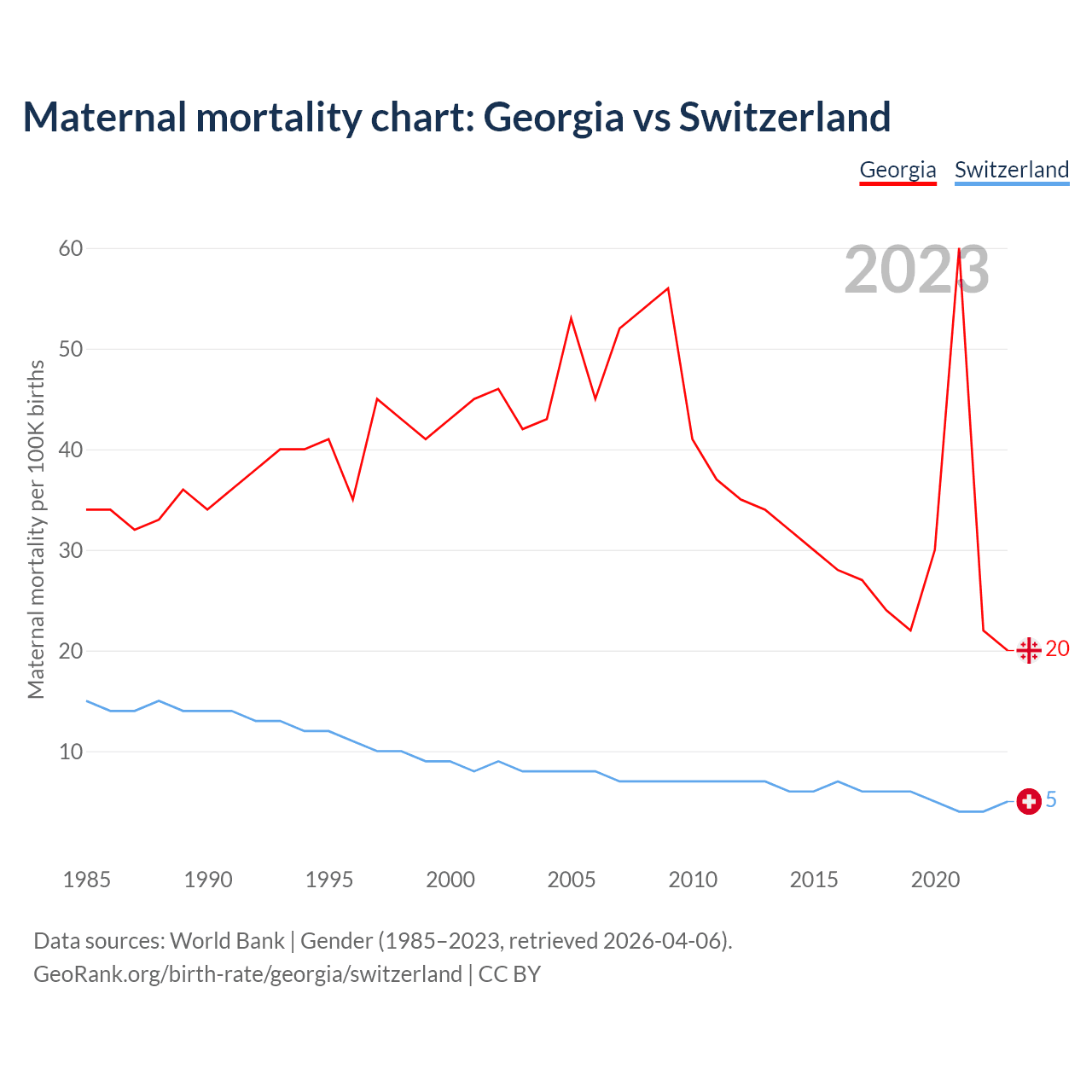 The maternal mortality rate, which is the probability of dying during childbirth or within 42 days of pregnancy termination, is 20 deaths per 100,000 live births in Georgia, compared to 5 deaths in Switzerland.