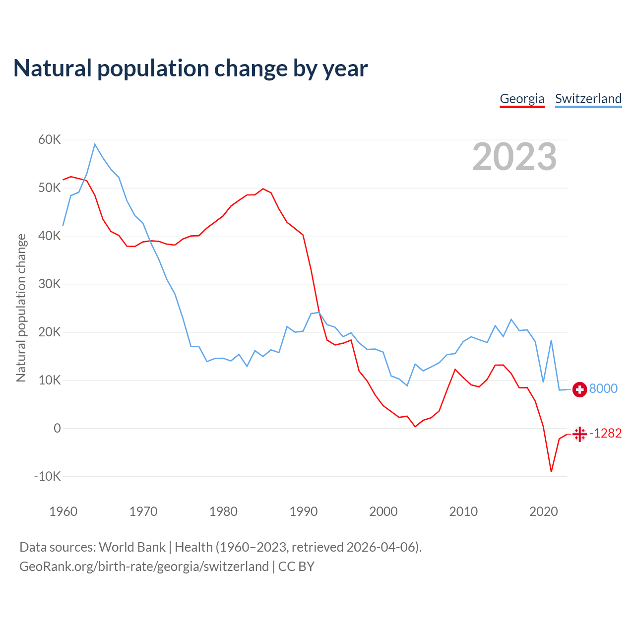 According to the latest available data on birth rates, the fertility rate in Georgia was 1.81 children per woman in 2023, compared to 1.33 in Switzerland in 2023. The replacement level is considered to be 2.1 children per woman.