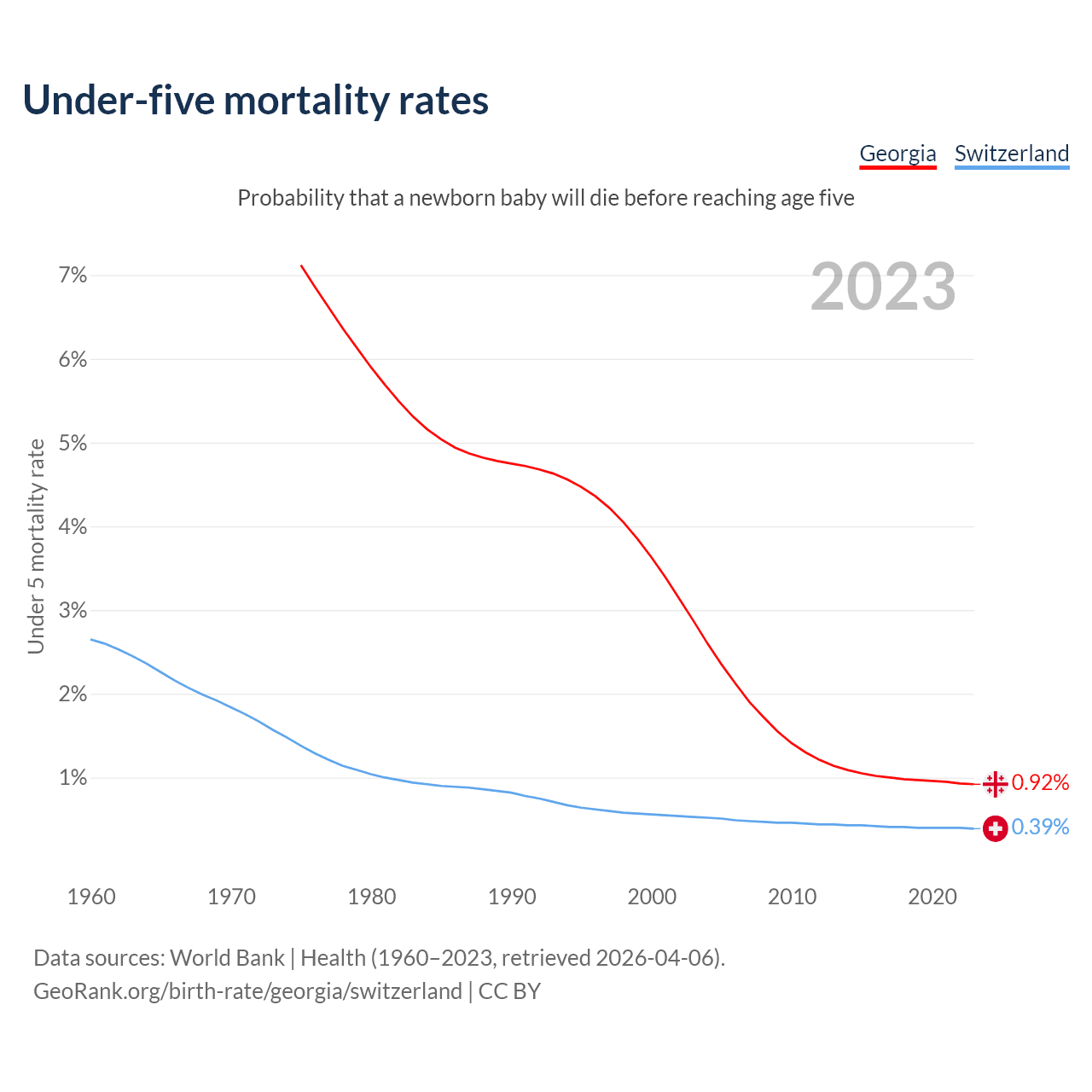 The chance that a newborn baby will die before reaching age five is 0.92% in Georgia and 0.39% in Switzerland. Above is a chart with historical data on under-five mortality rates.