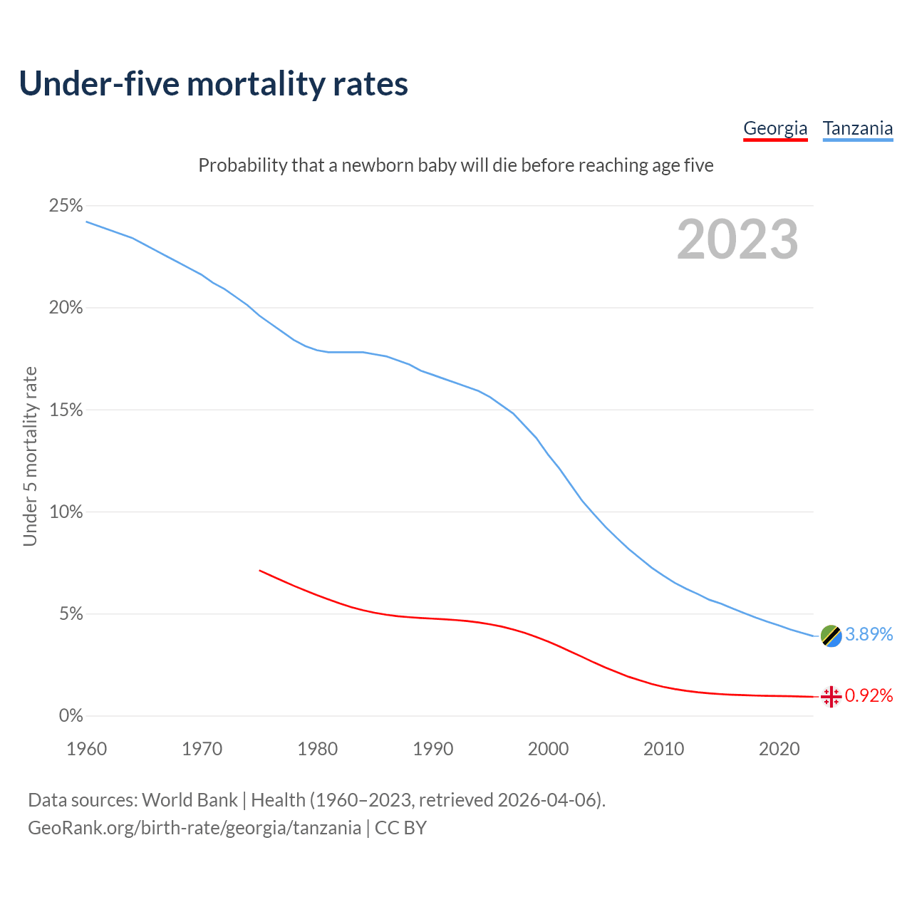 The chance that a newborn baby will die before reaching age five is 0.92% in Georgia and 3.89% in Tanzania. Above is a chart with historical data on under-five mortality rates.