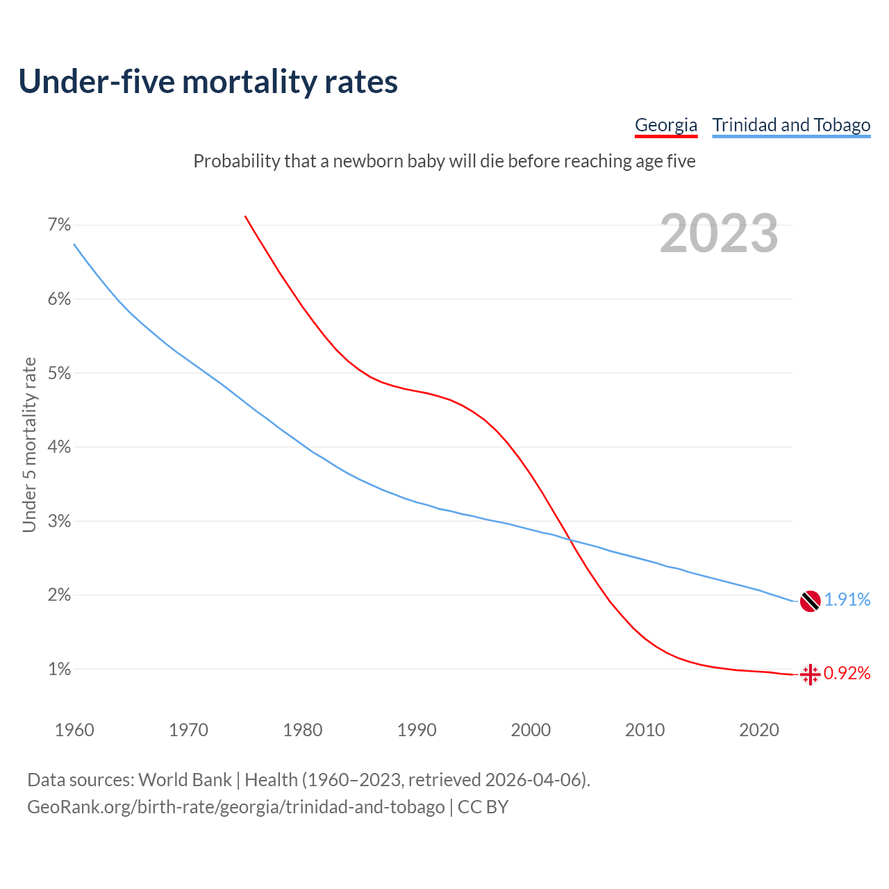 The chance that a newborn baby will die before reaching age five is 0.92% in Georgia and 1.91% in Trinidad and Tobago. Above is a chart with historical data on under-five mortality rates.