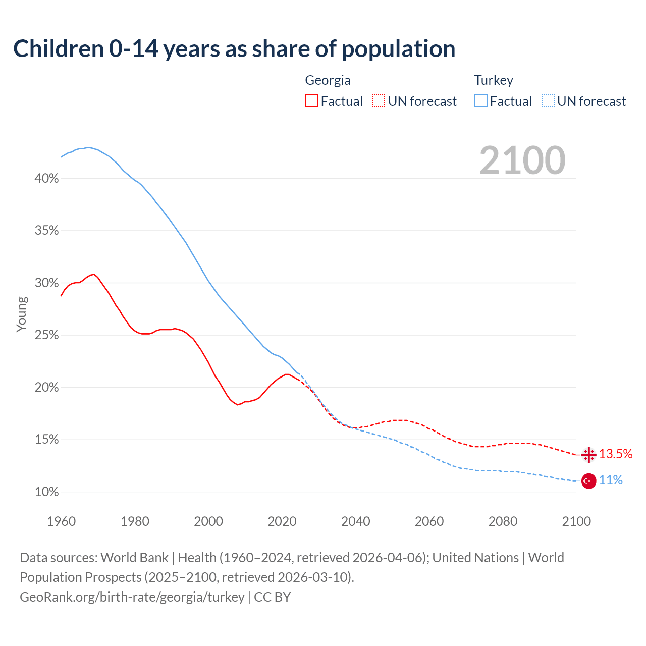 Georgia has an annual birth rate of 11.5 births per 1,000 people, compared to 11.2 for Turkey. The average number of children a woman is expected to have during her lifetime — the fertility rate, is 1.81 in Georgia and 1.51 in Turkey — 16.6% difference.