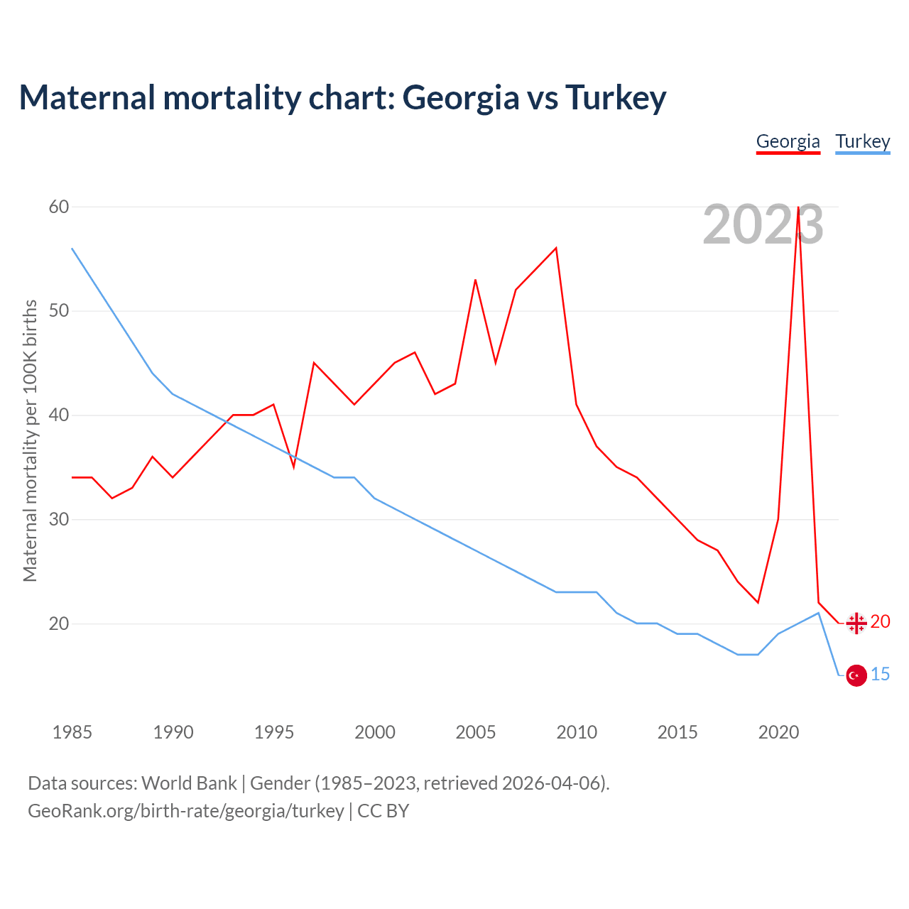 The maternal mortality rate, which is the probability of dying during childbirth or within 42 days of pregnancy termination, is 20 deaths per 100,000 live births in Georgia, compared to 15 deaths in Turkey.