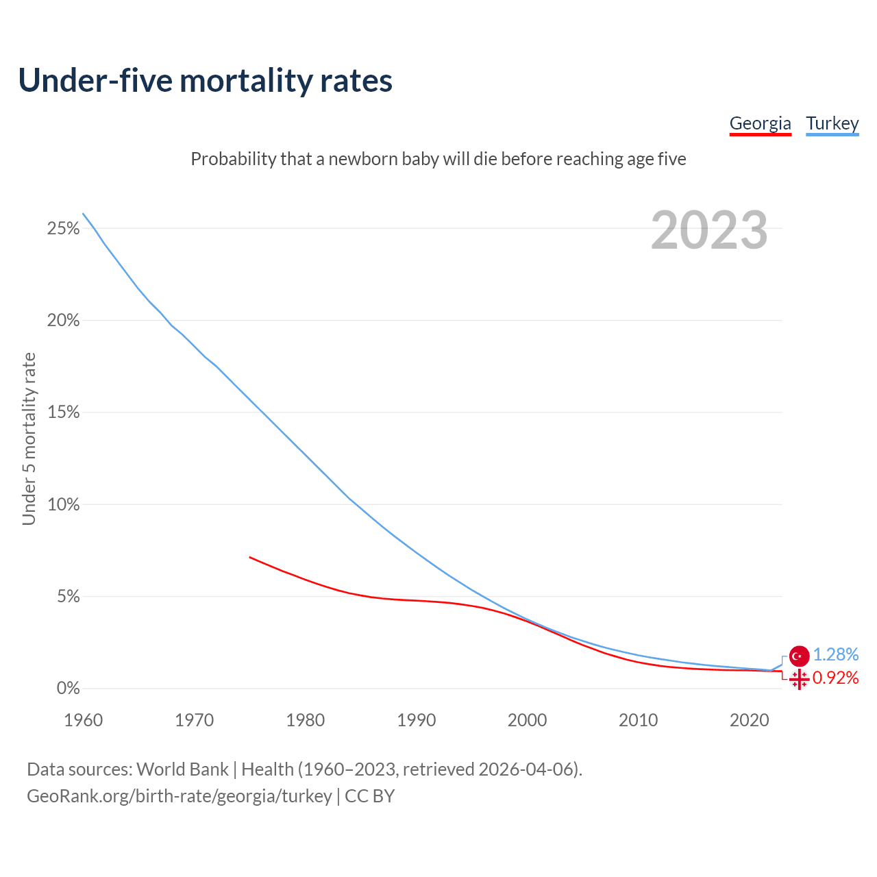 The chance that a newborn baby will die before reaching age five is 0.92% in Georgia and 1.28% in Turkey. Above is a chart with historical data on under-five mortality rates.