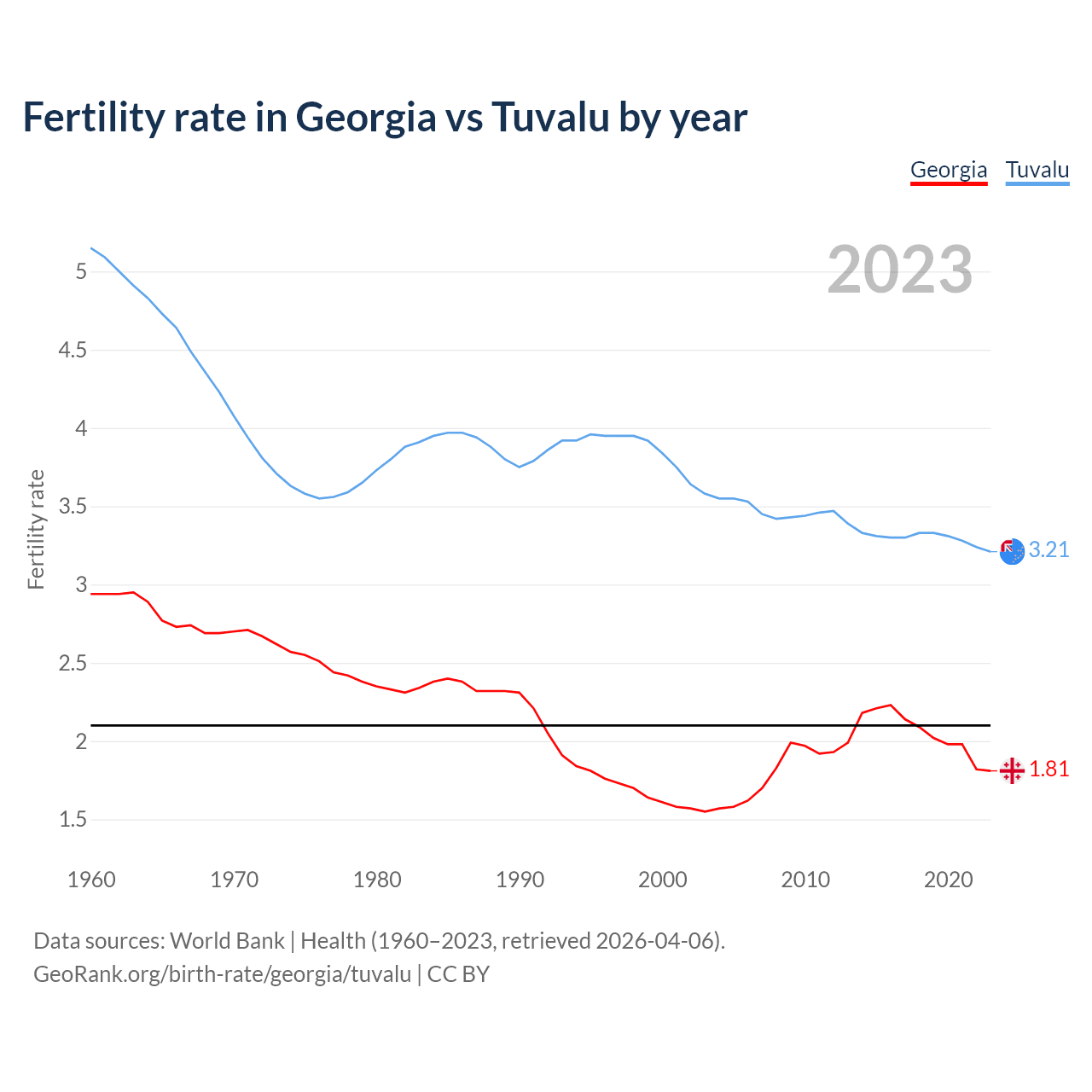 1960 vs 2023, the fertility rate has decreased by 38.5% in Georgia and by 37.7% in Tuvalu — in 1960, it was 2.94 and 5.15, respectively.