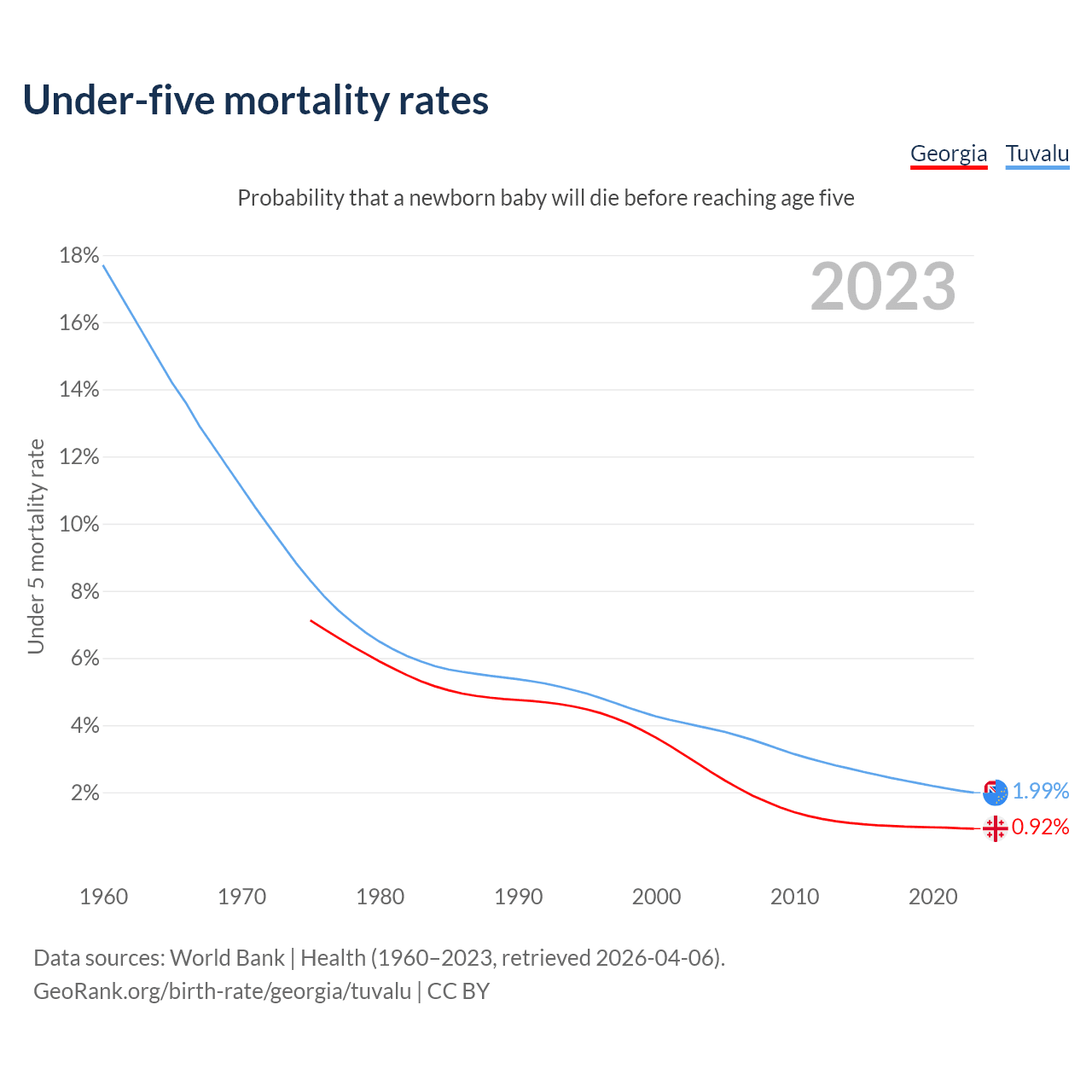 The chance that a newborn baby will die before reaching age five is 0.92% in Georgia and 1.99% in Tuvalu. Above is a chart with historical data on under-five mortality rates.