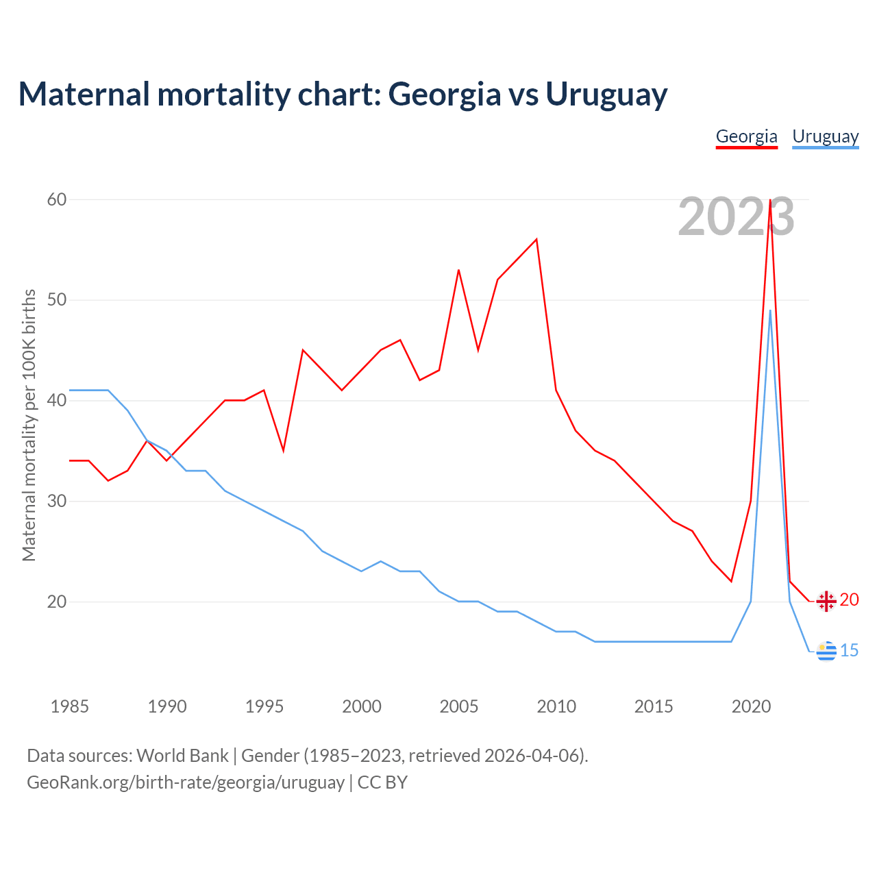The maternal mortality rate, which is the probability of dying during childbirth or within 42 days of pregnancy termination, is 20 deaths per 100,000 live births in Georgia, compared to 15 deaths in Uruguay.