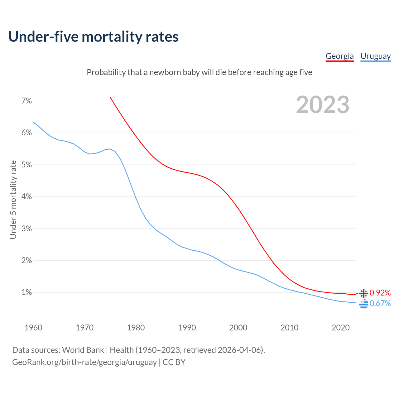 The chance that a newborn baby will die before reaching age five is 0.92% in Georgia and 0.67% in Uruguay. Above is a chart with historical data on under-five mortality rates.