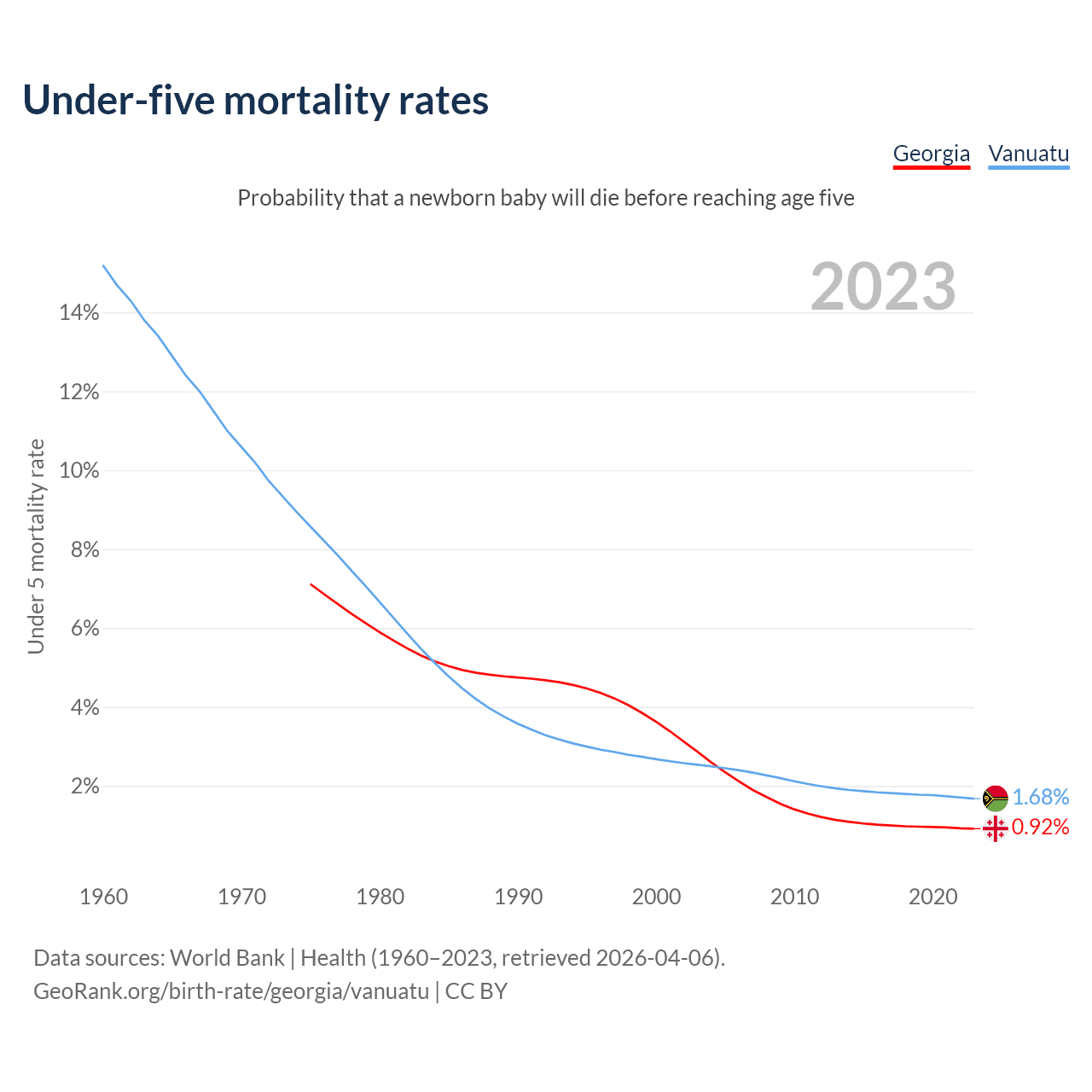 The chance that a newborn baby will die before reaching age five is 0.92% in Georgia and 1.68% in Vanuatu. Above is a chart with historical data on under-five mortality rates.
