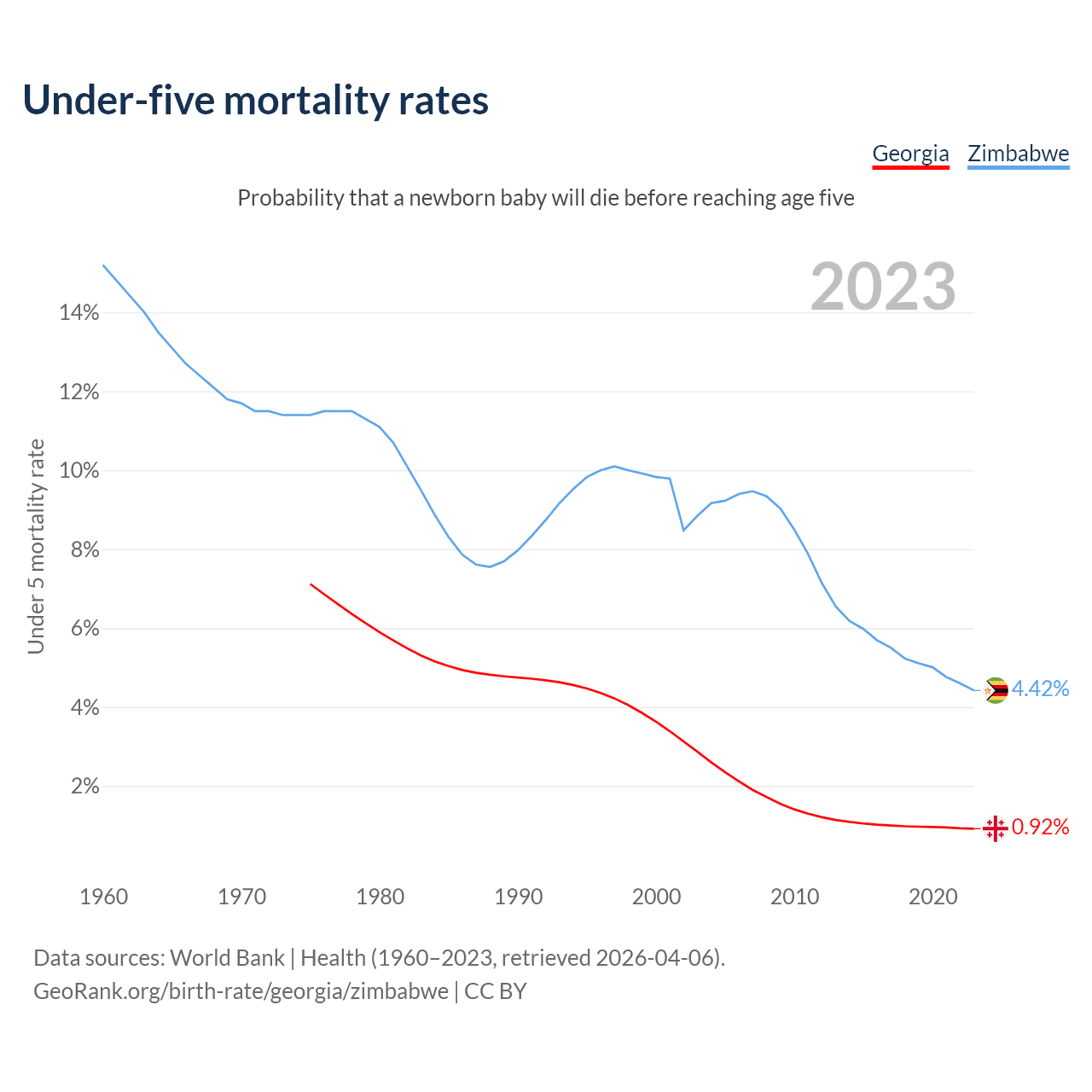 The chance that a newborn baby will die before reaching age five is 0.92% in Georgia and 4.42% in Zimbabwe. Above is a chart with historical data on under-five mortality rates.