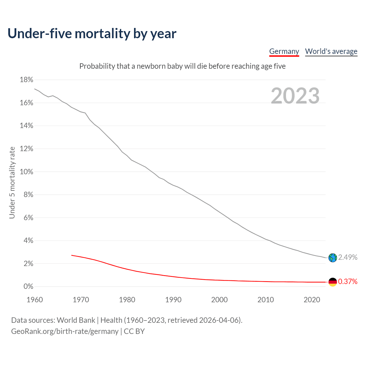 The under-5 mortality rate in Germany was 3.7 deaths per 1,000 live births in 2023 — a 0.37% chance that a newborn baby will die before reaching age five. This is down from 5.4 deaths per 1,000 live births in 2000.