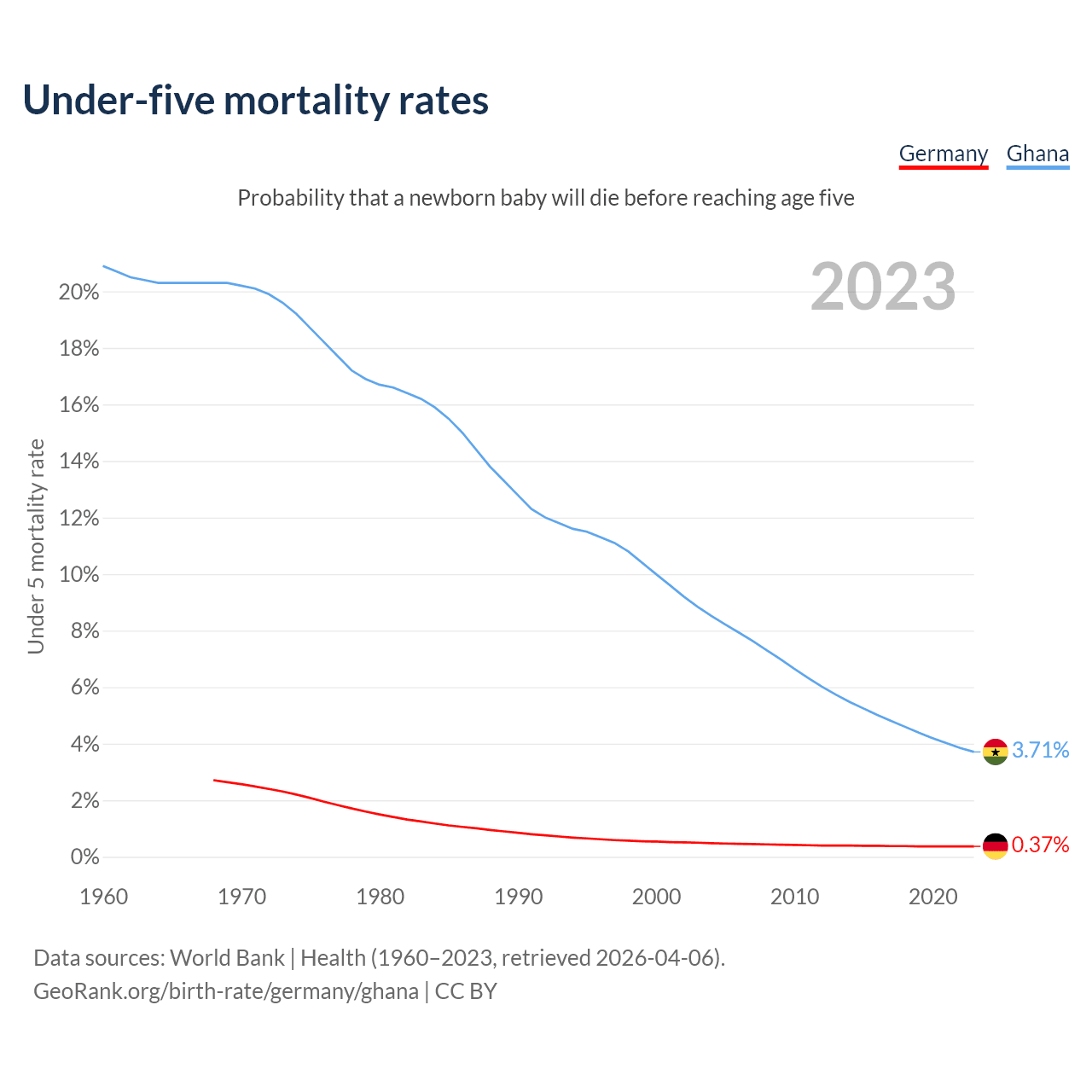 The chance that a newborn baby will die before reaching age five is 0.37% in Germany and 3.71% in Ghana. Above is a chart with historical data on under-five mortality rates.