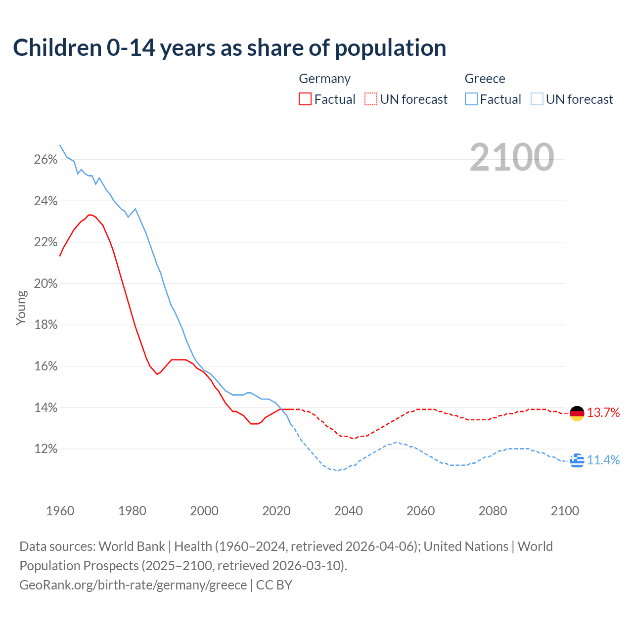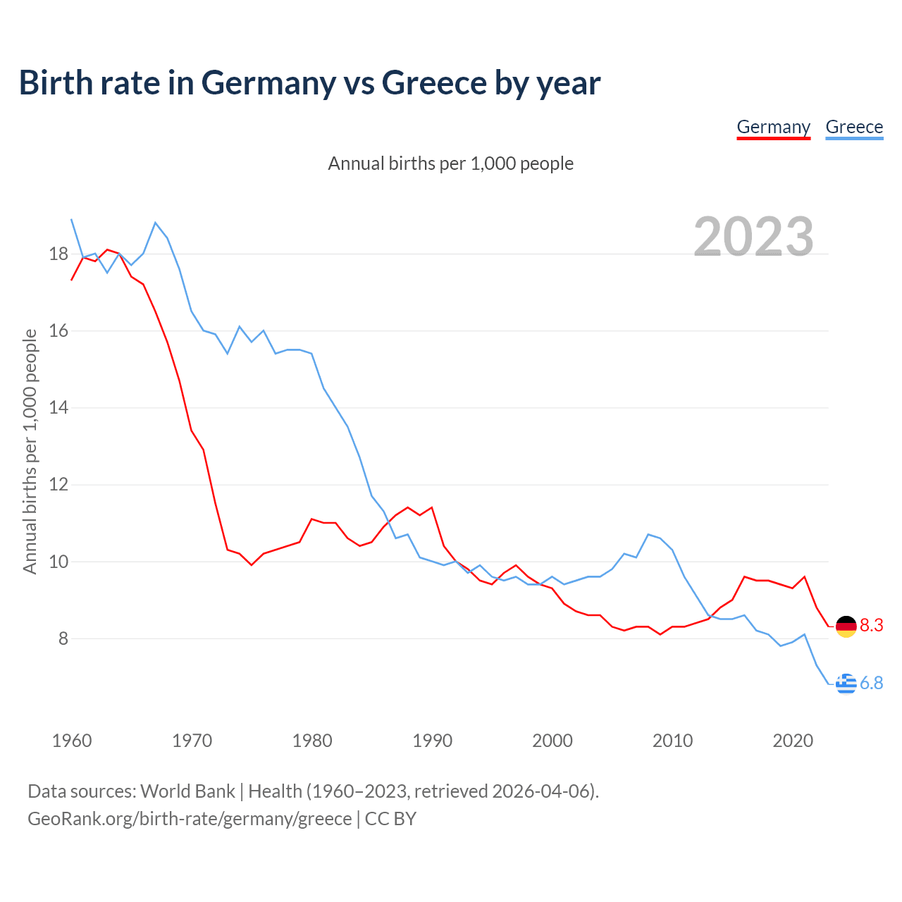 According to the latest available data on birth rates, the fertility rate in Germany was 1.39 children per woman in 2023, compared to 1.32 in Greece in 2023. The replacement level is considered to be 2.1 children per woman.