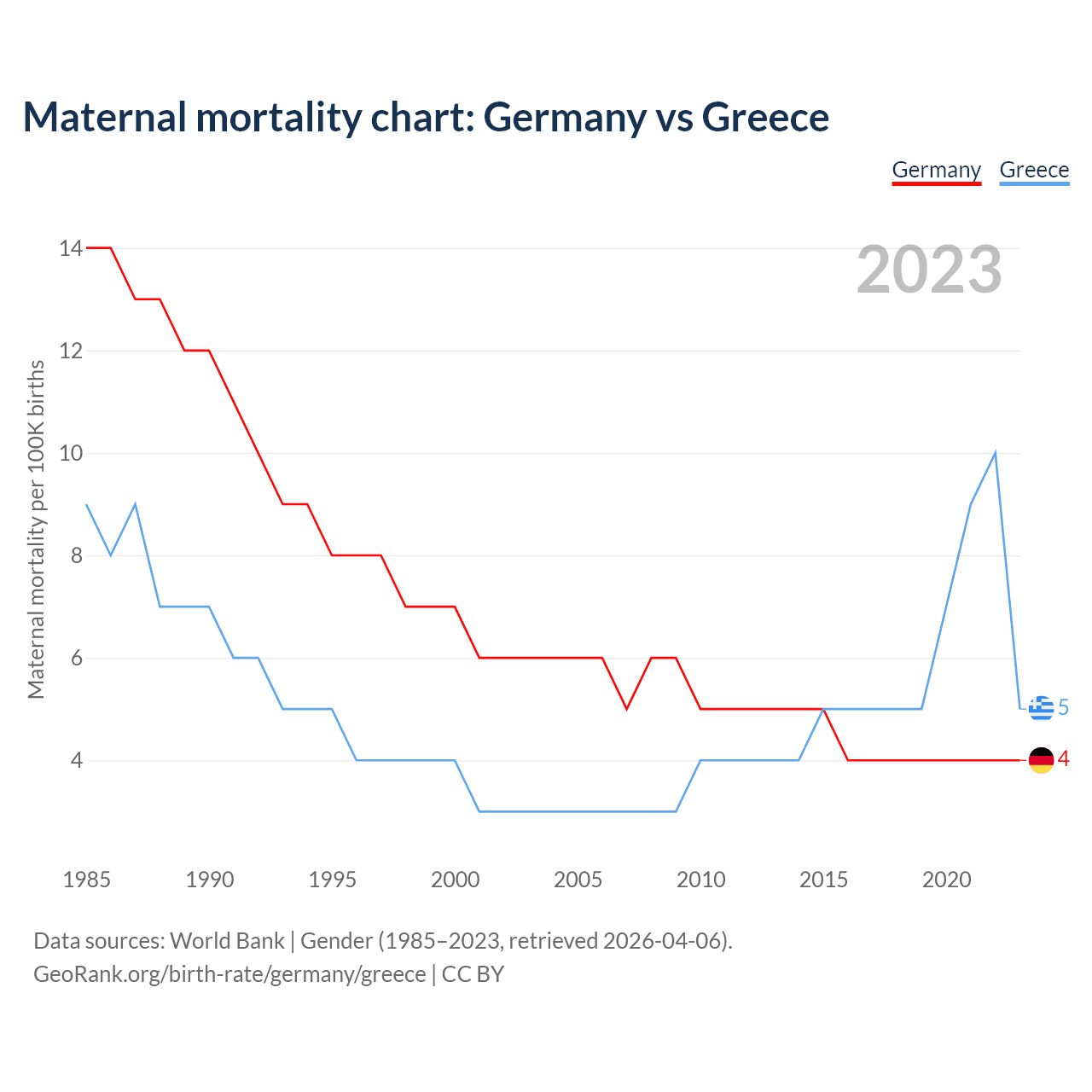 The maternal mortality rate, which is the probability of dying during childbirth or within 42 days of pregnancy termination, is 4 deaths per 100,000 live births in Germany, compared to 5 deaths in Greece.