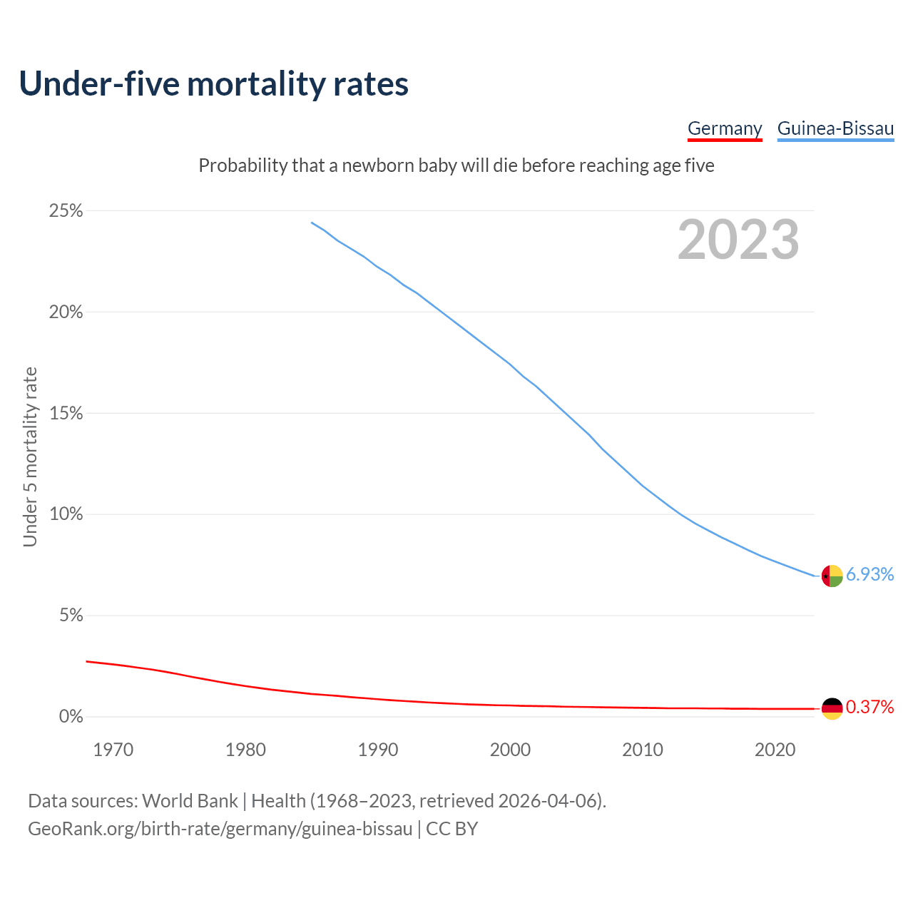 The chance that a newborn baby will die before reaching age five is 0.37% in Germany and 6.93% in Guinea-Bissau. Above is a chart with historical data on under-five mortality rates.