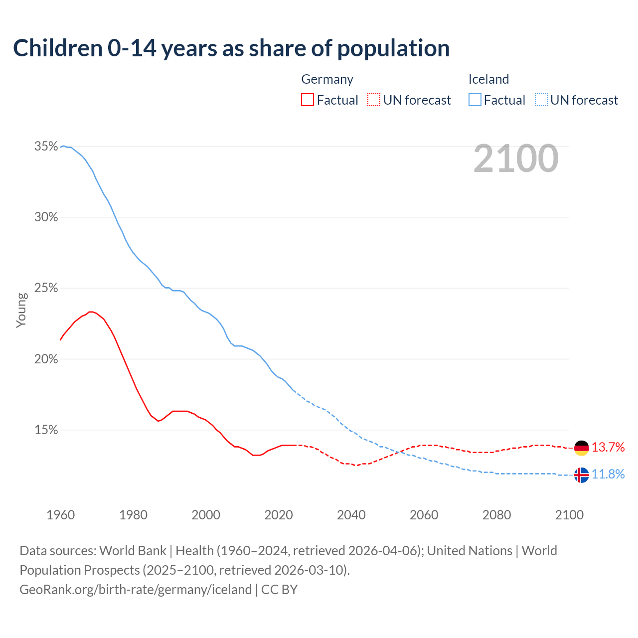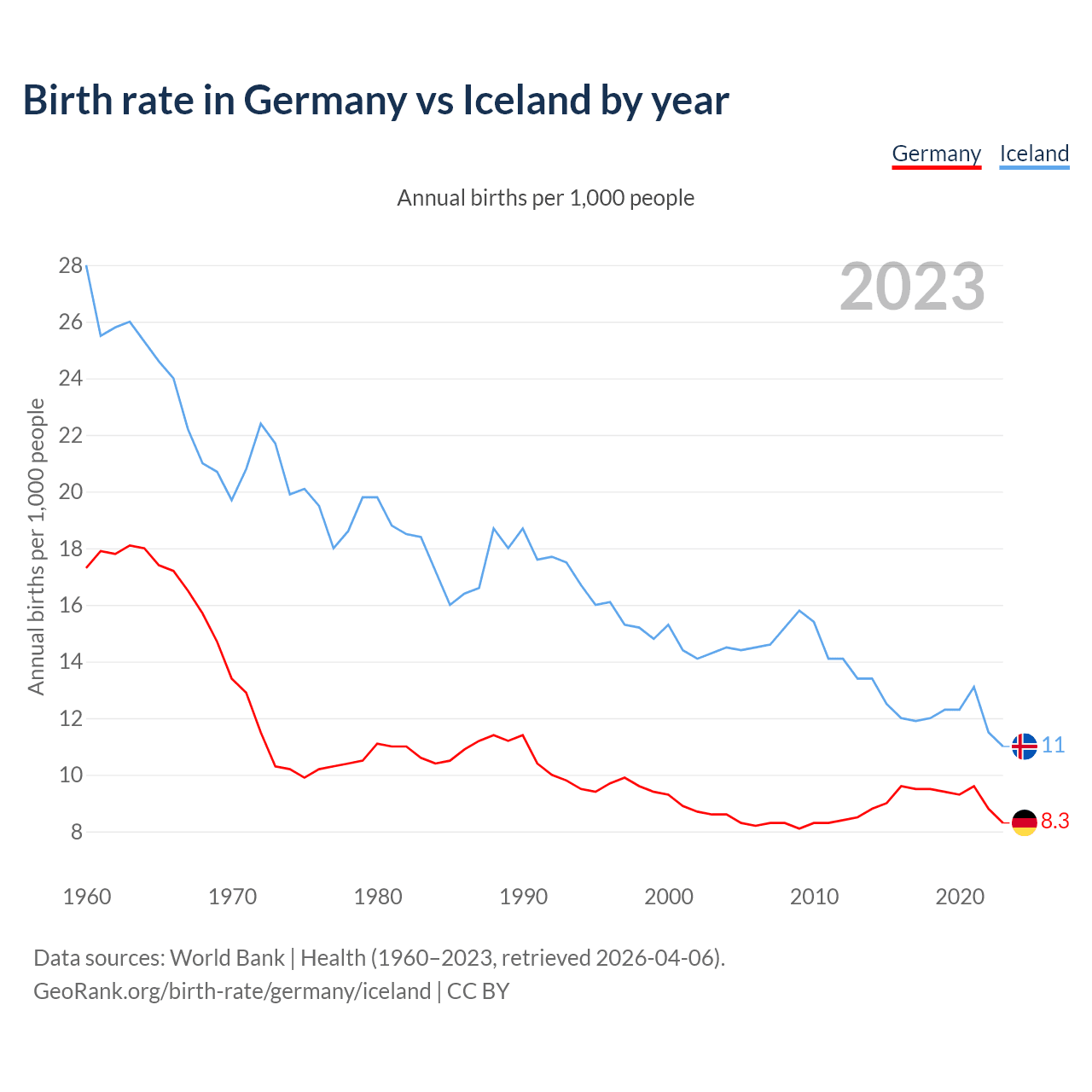 Germany has an annual birth rate of 8.3 births per 1,000 people, compared to 11 for Iceland. The average number of children a woman is expected to have during her lifetime — the fertility rate, is 1.39 in Germany and 1.59 in Iceland — 14.4% difference.