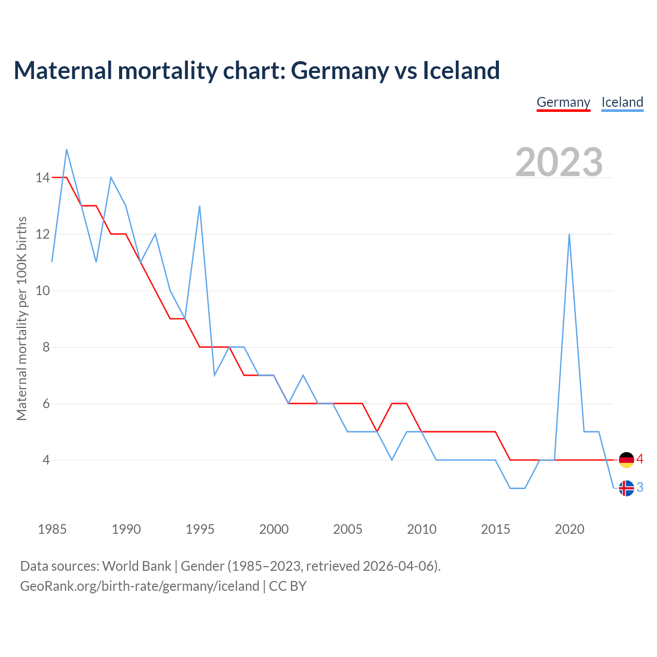 The maternal mortality rate, which is the probability of dying during childbirth or within 42 days of pregnancy termination, is 4 deaths per 100,000 live births in Germany, compared to 3 deaths in Iceland.