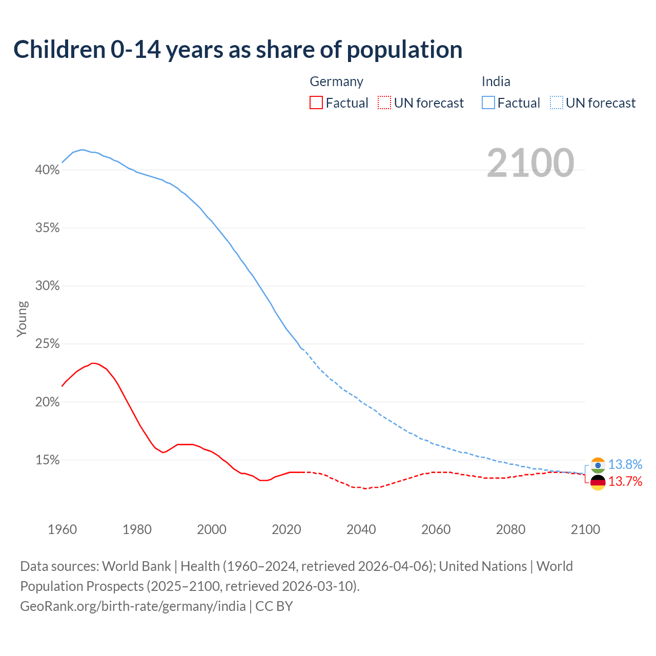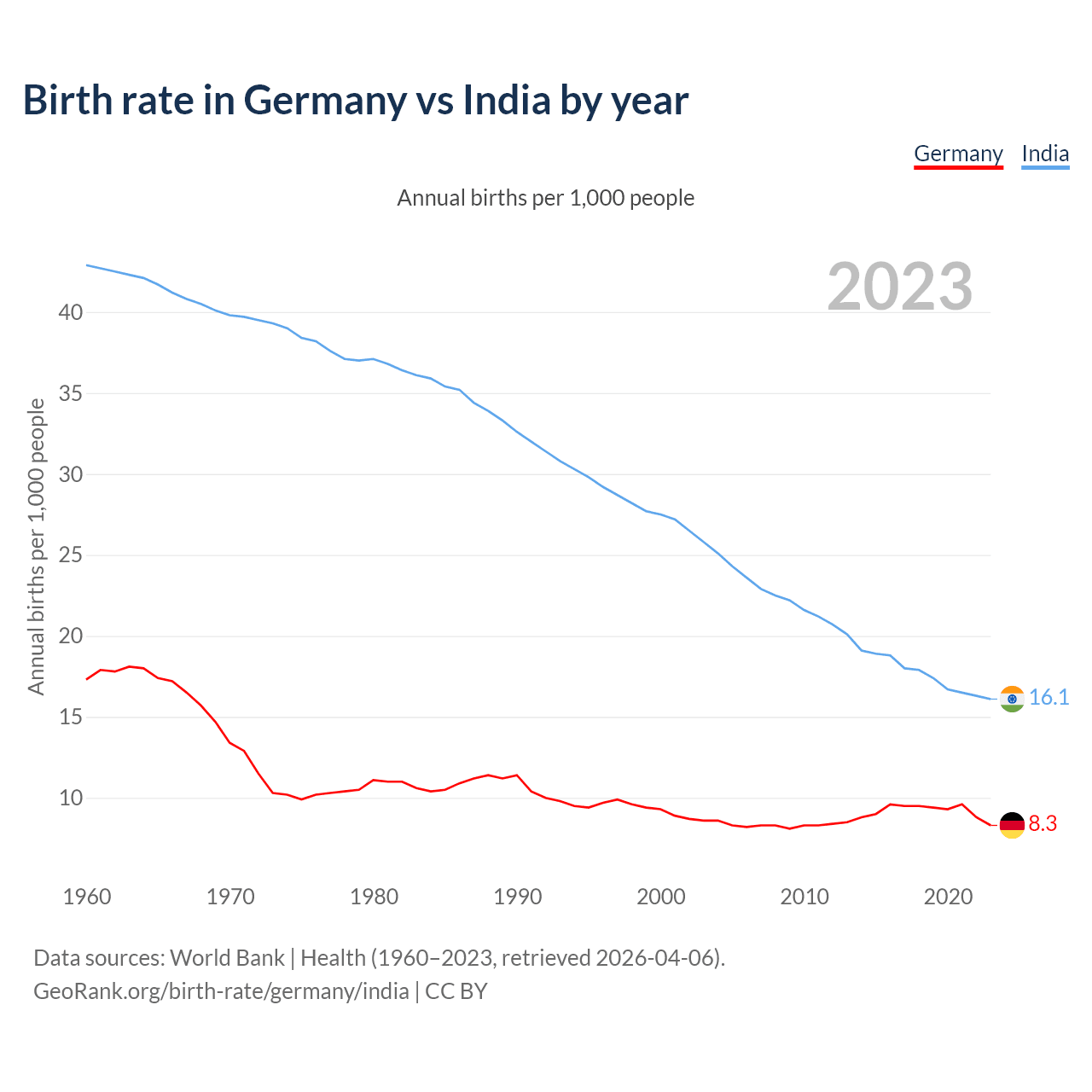 According to the latest available data on birth rates, the fertility rate in Germany was 1.39 children per woman in 2023, compared to 1.98 in India in 2023. The replacement level is considered to be 2.1 children per woman.