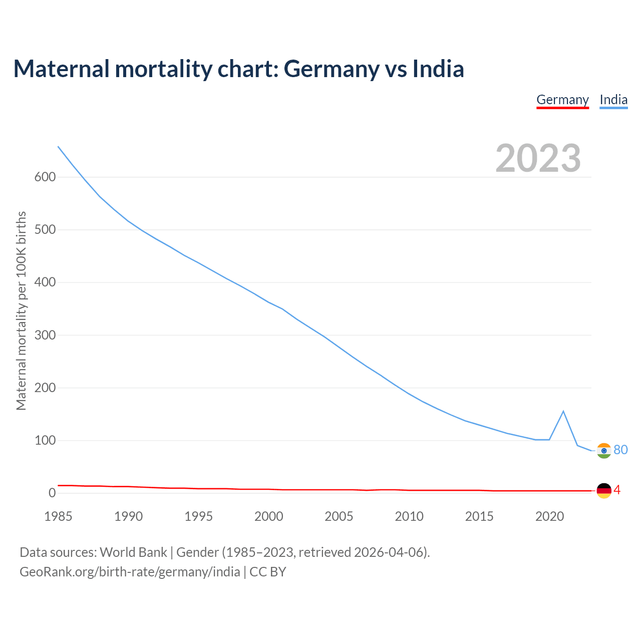 The maternal mortality rate, which is the probability of dying during childbirth or within 42 days of pregnancy termination, is 4 deaths per 100,000 live births in Germany, compared to 80 deaths in India.