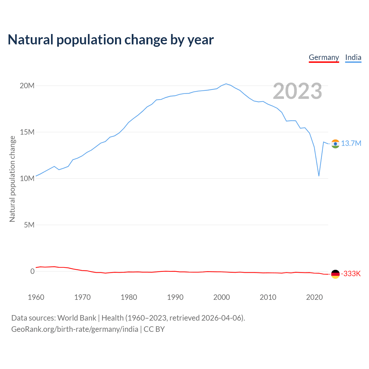 Germany has an annual birth rate of 8.3 births per 1,000 people, compared to 16.1 for India. The average number of children a woman is expected to have during her lifetime — the fertility rate, is 1.39 in Germany and 1.98 in India — 42.1% difference.